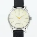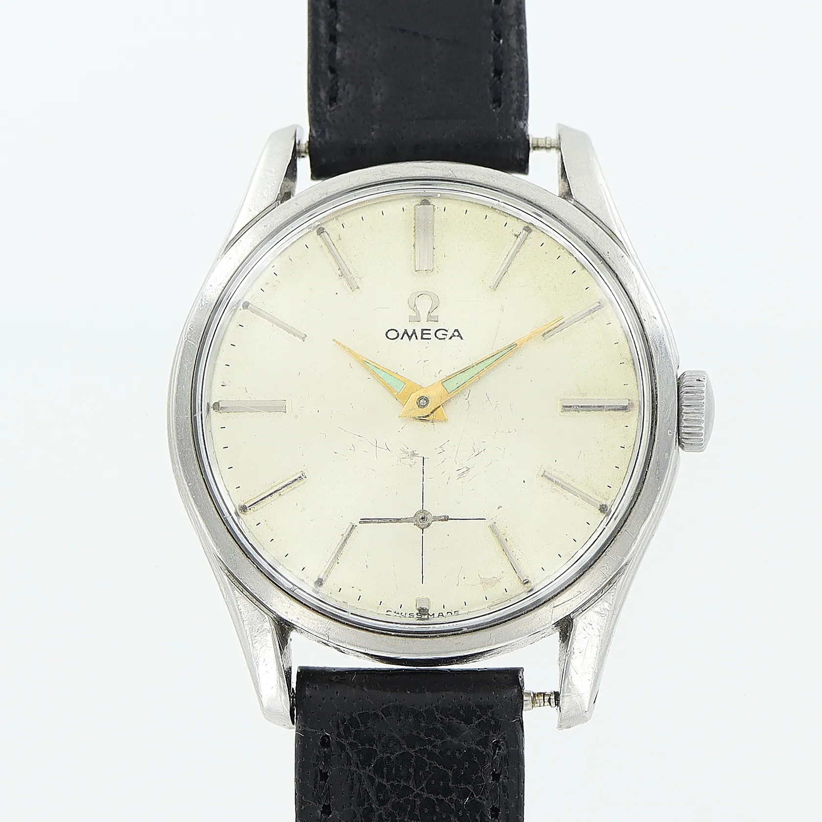 Herrur Omega, stål, manuell, Ø34mm, vit urtavla, liten sekundvisare, verk nr 13838952, caliber 266, ref nr 2639-15, läderband ej original, 23cm, smuts/repor på urtavla, repor och hack på glas och boett, inga tillbehör.