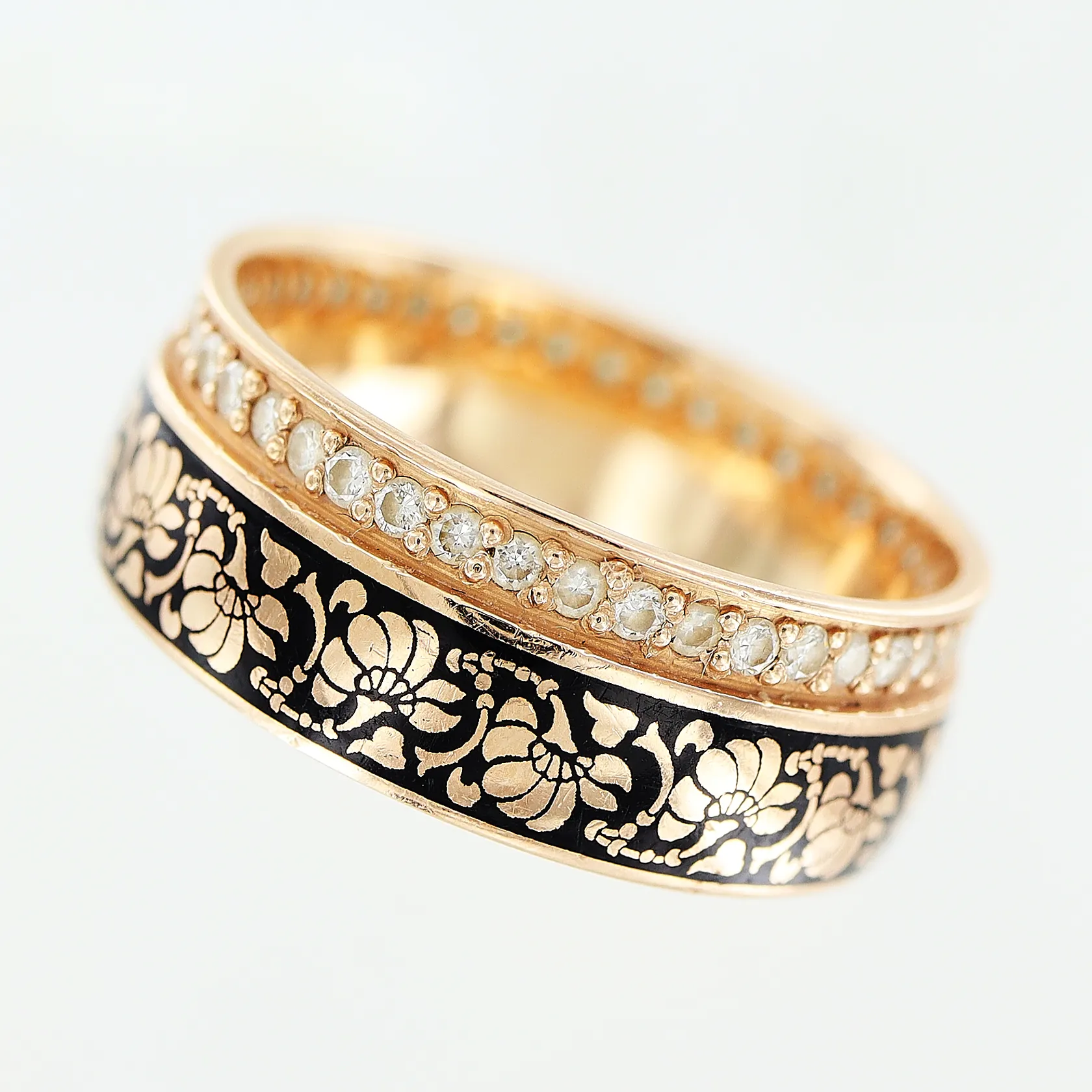 Ring, emalj, vita stenar, stl 16¾, bredd 7mm, 14K Vikt: 5,2 g.