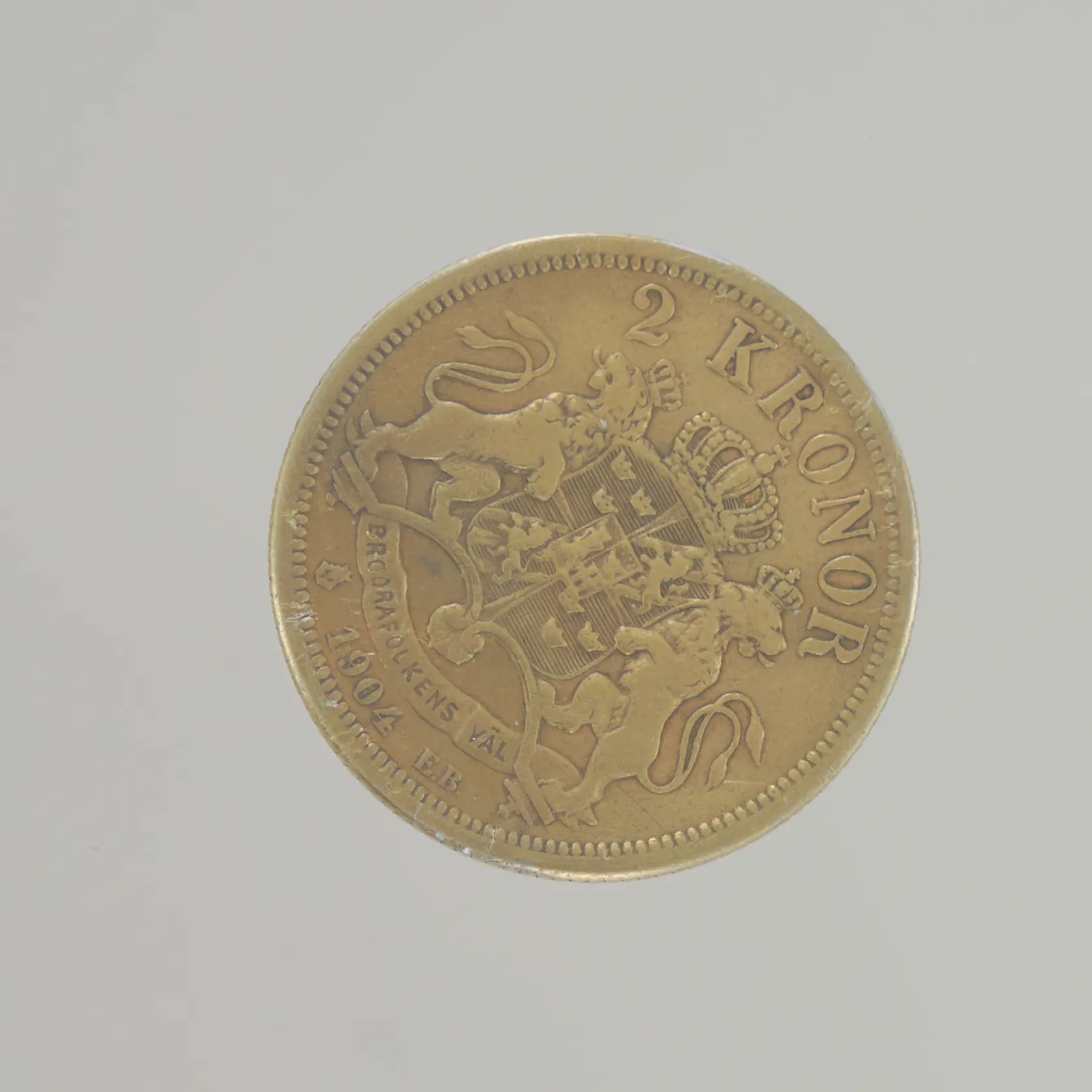 silvermynt förgyllt 2kr Oscar II år 1904, hack på sidan Vikt: 14,8 g.