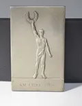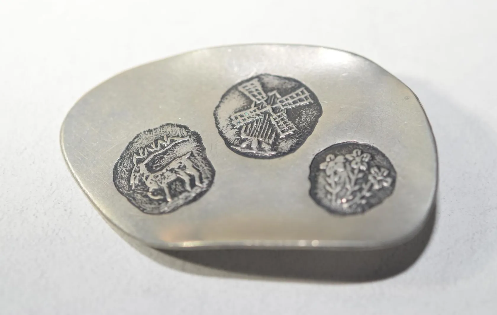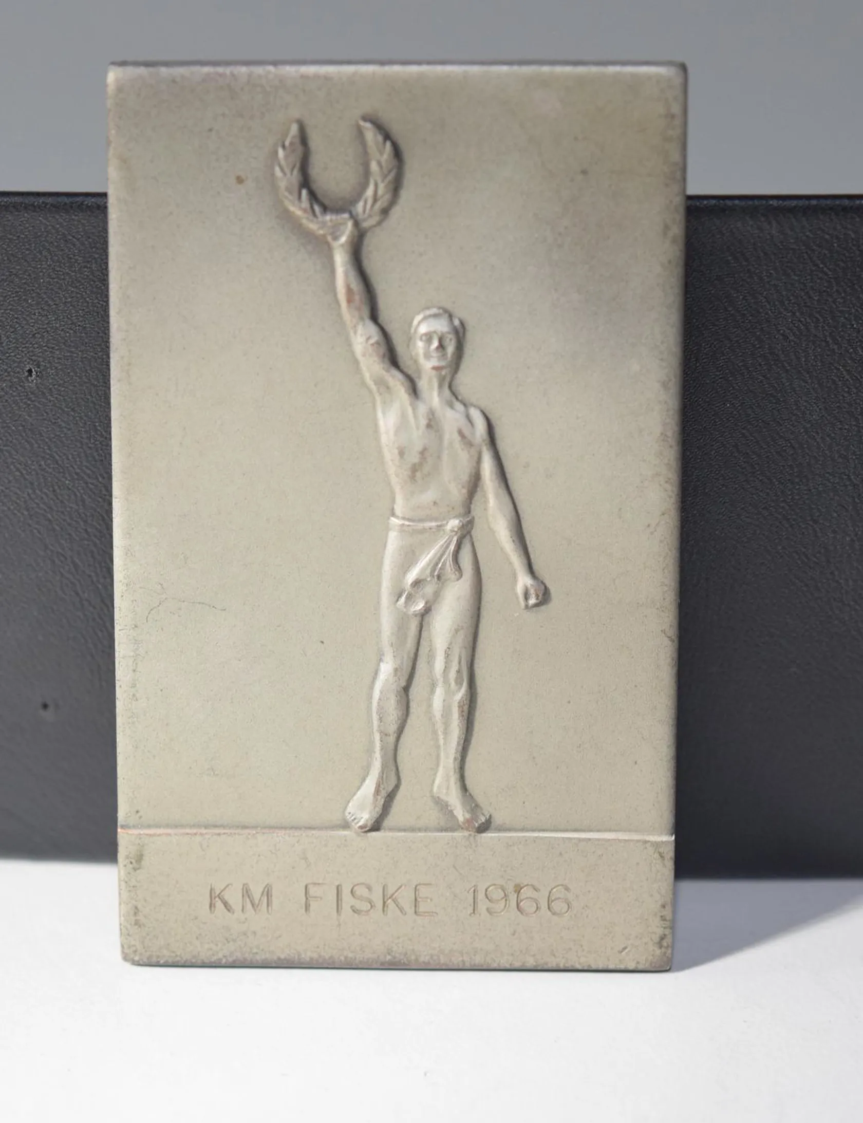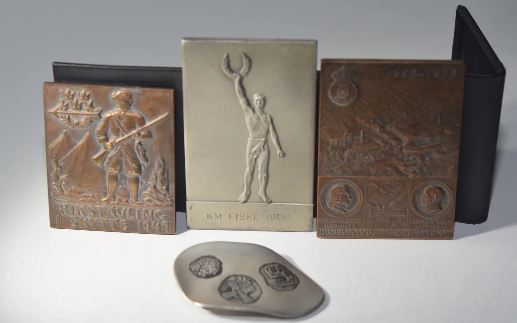Plaketter 3st: "Rikstävling i skytte" längd 6cm bredd 4,8 cm + Minnesplakett "Husqvarnavapenfabrikisaktiebolag 1689-1939" , längd 7,2cm bredd 5,2 cm + Prisplakett "KM FISKE1966" + 1 brosch i tenn, signerad Tenn k.k.