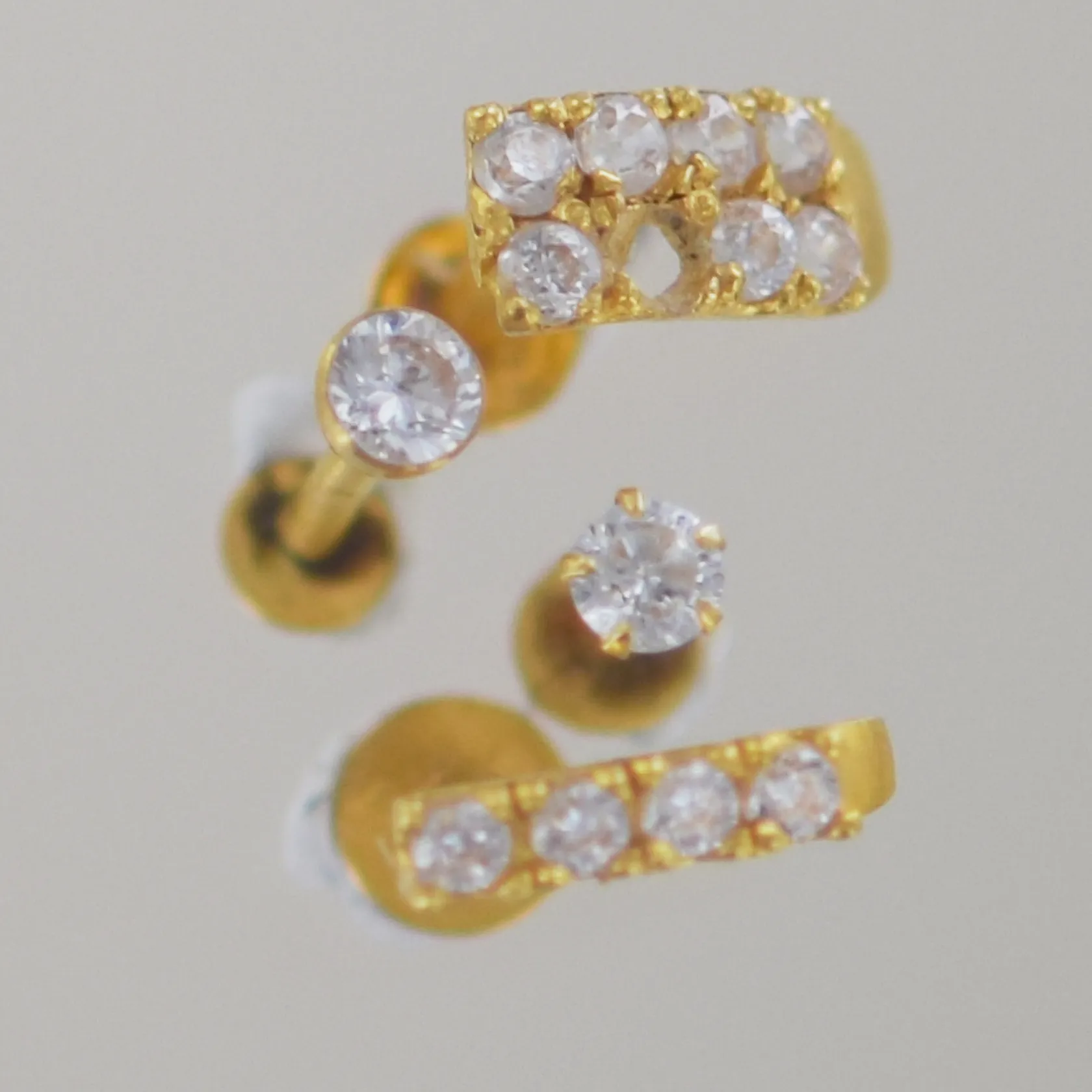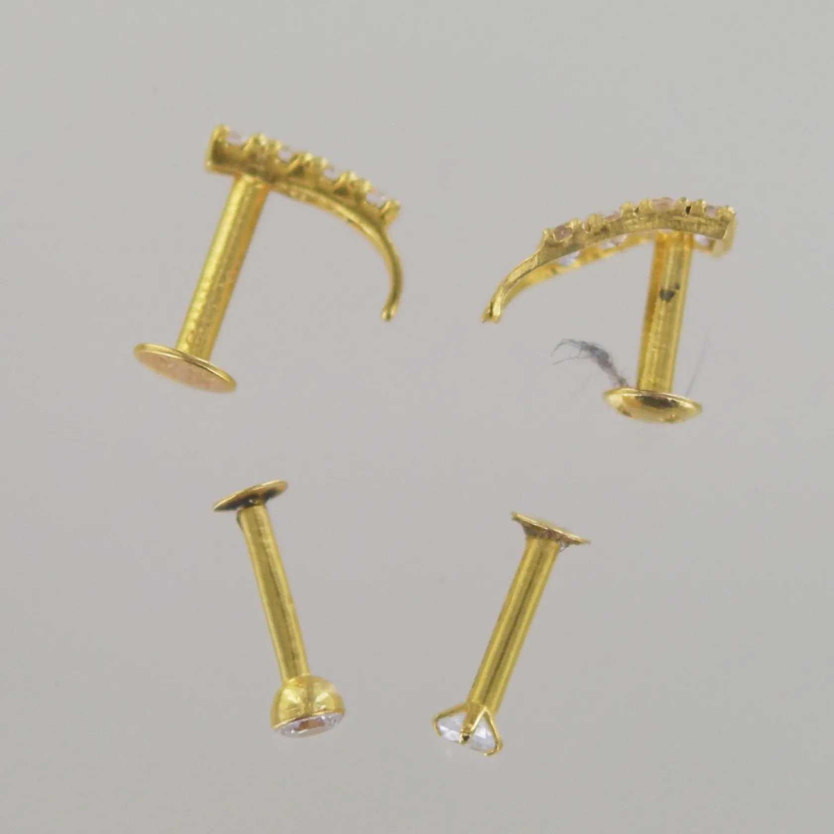 Nässmycken 4st med diamanter,, 2st 1x1cm (en sten saknas på det ena), 2st stift H 1cm, 22k Vikt: 1,1 g.