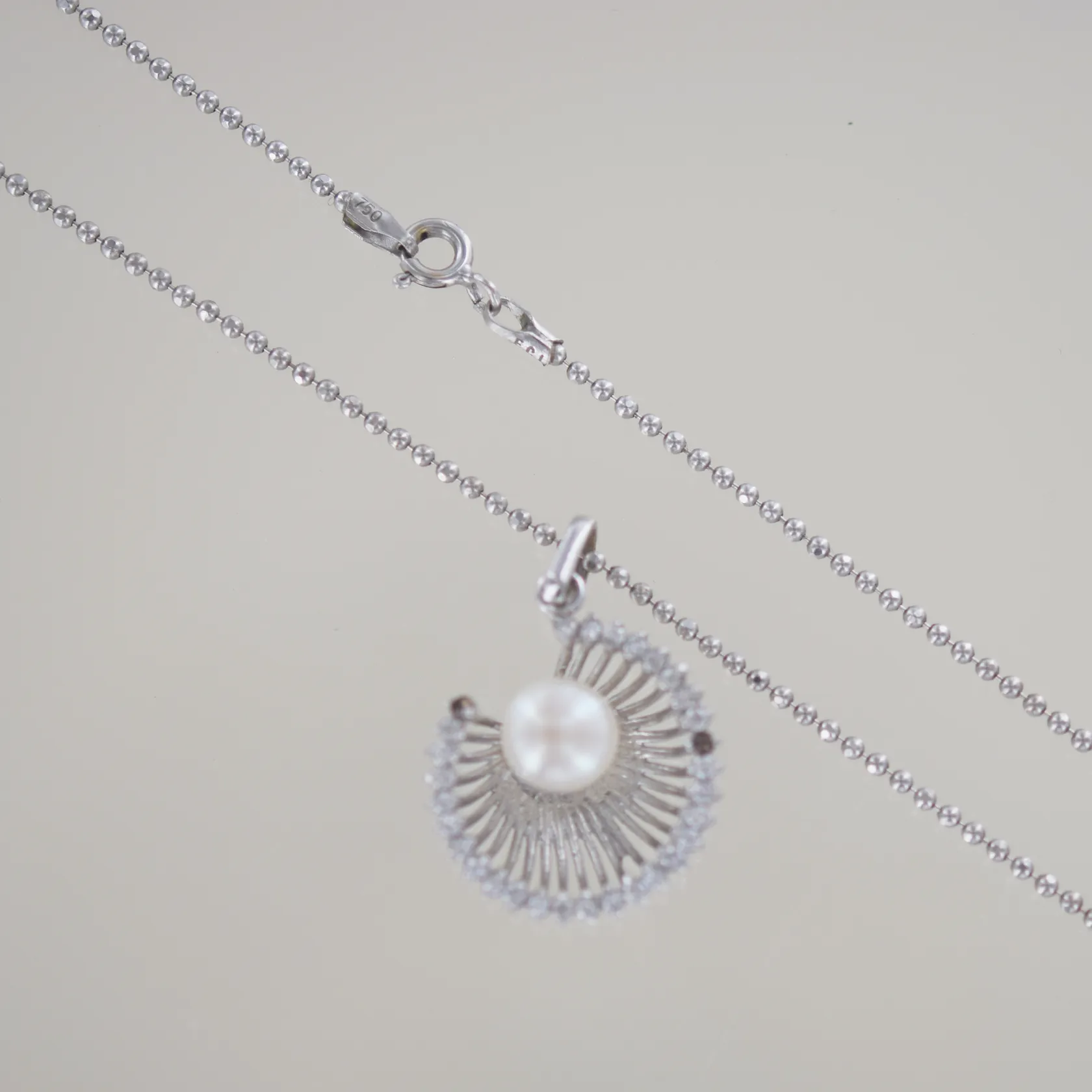 Collier med hänge med 28 zirkoner (2 saknas) + pärla, B 1,8 cm vitguld 18k Vikt: 7,7 g.