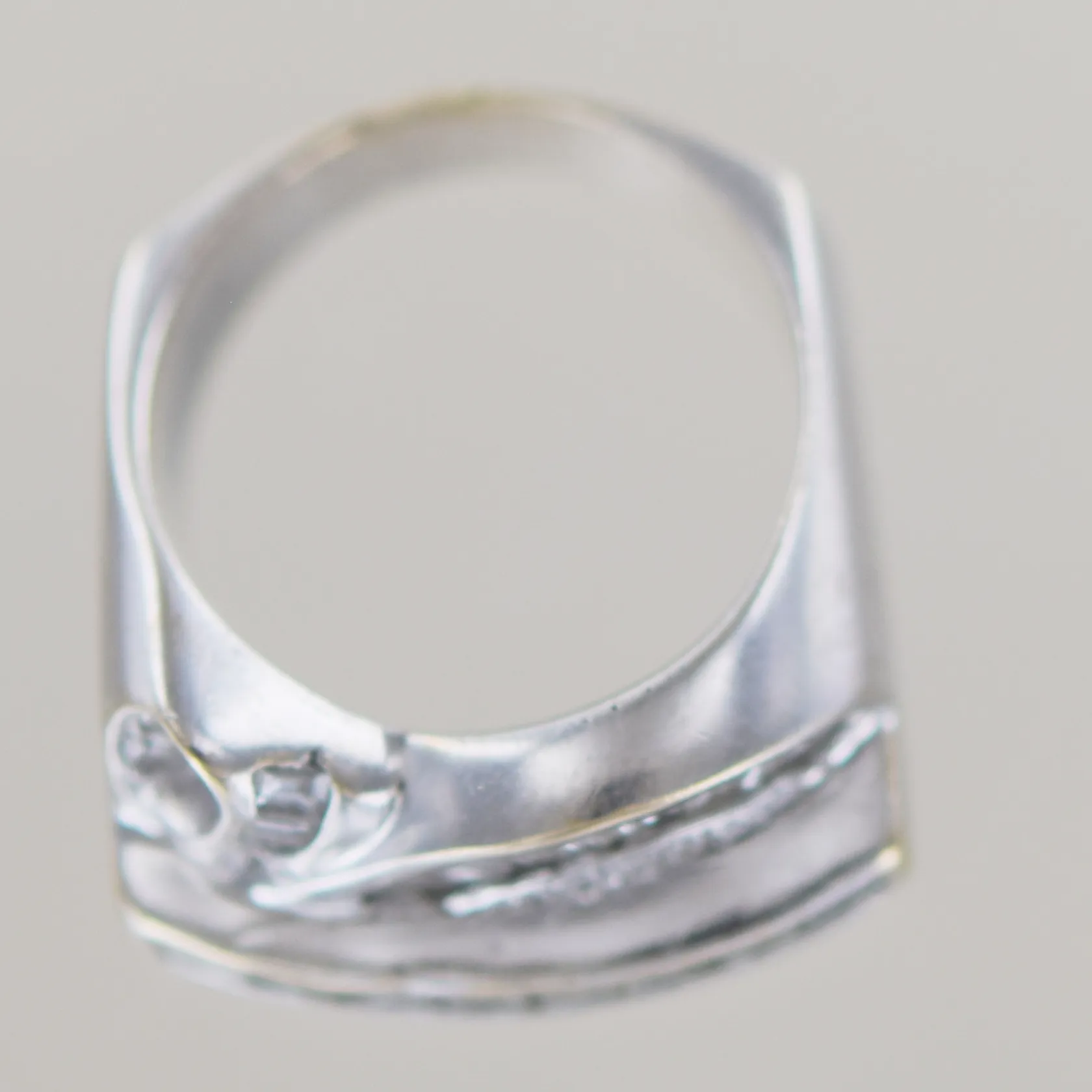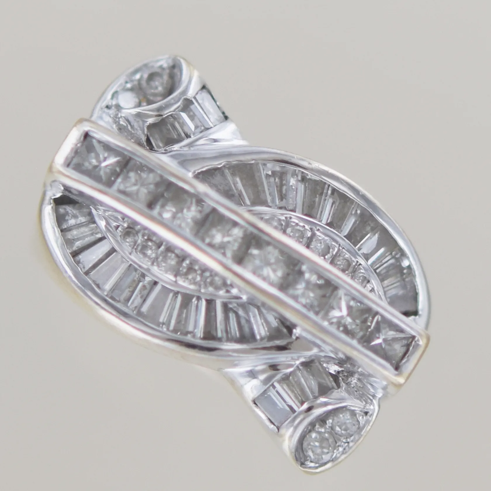 Ring guld 18k, 12,2g, rhodierad, med 8 princesssdiamanter, 25 Trapetzdiamanter och 9 Briljanter c:a 1,00-1,20ct tot. Ung kval: W/TCR (H/I). VVS/VS. God slipning. Vikt: 12,2 g.