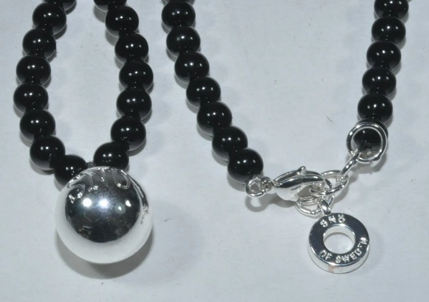 Halskedja med svarta stenar + 2 hängen , Längd 42 cm, Vikt: 55,8 g.