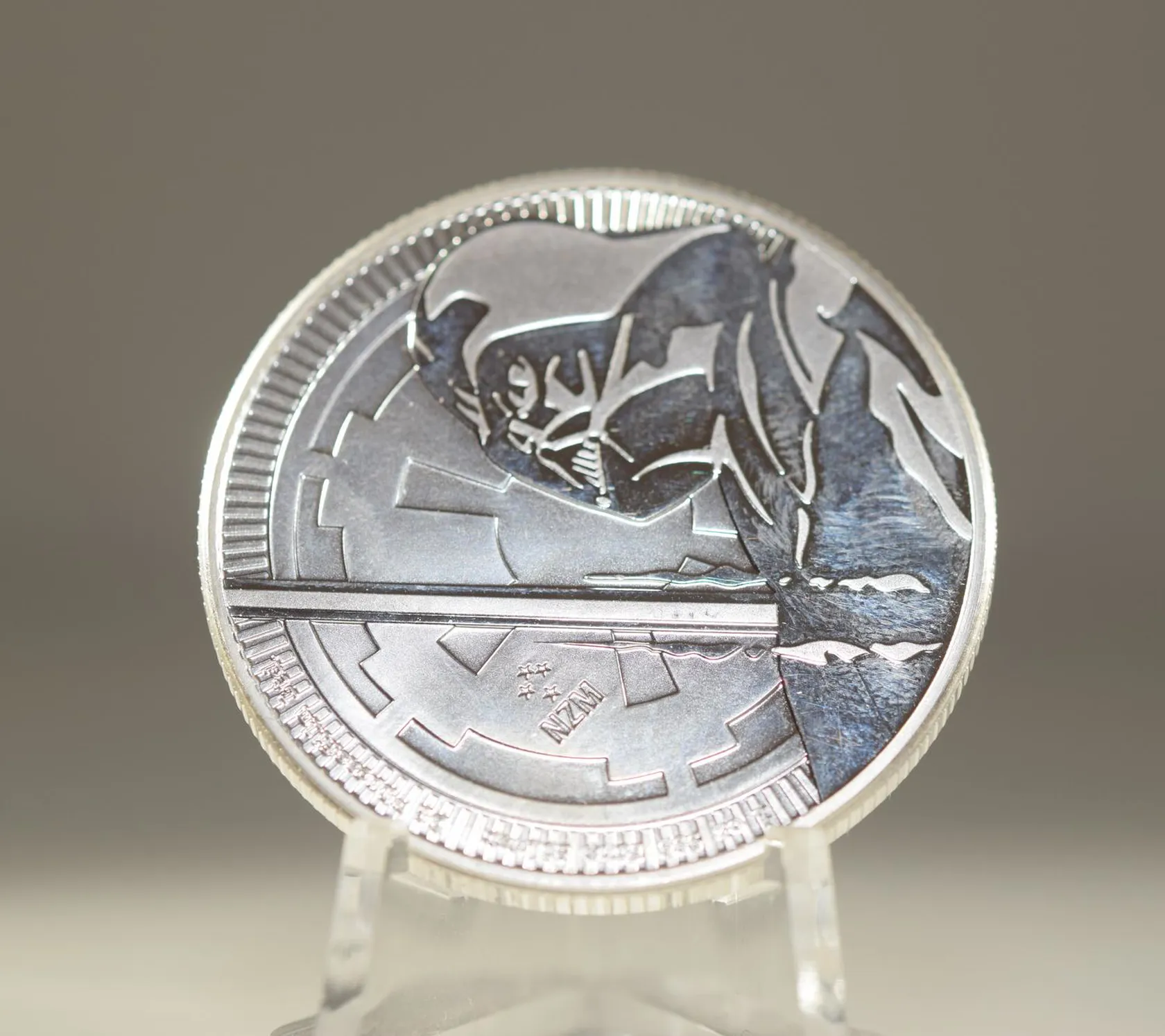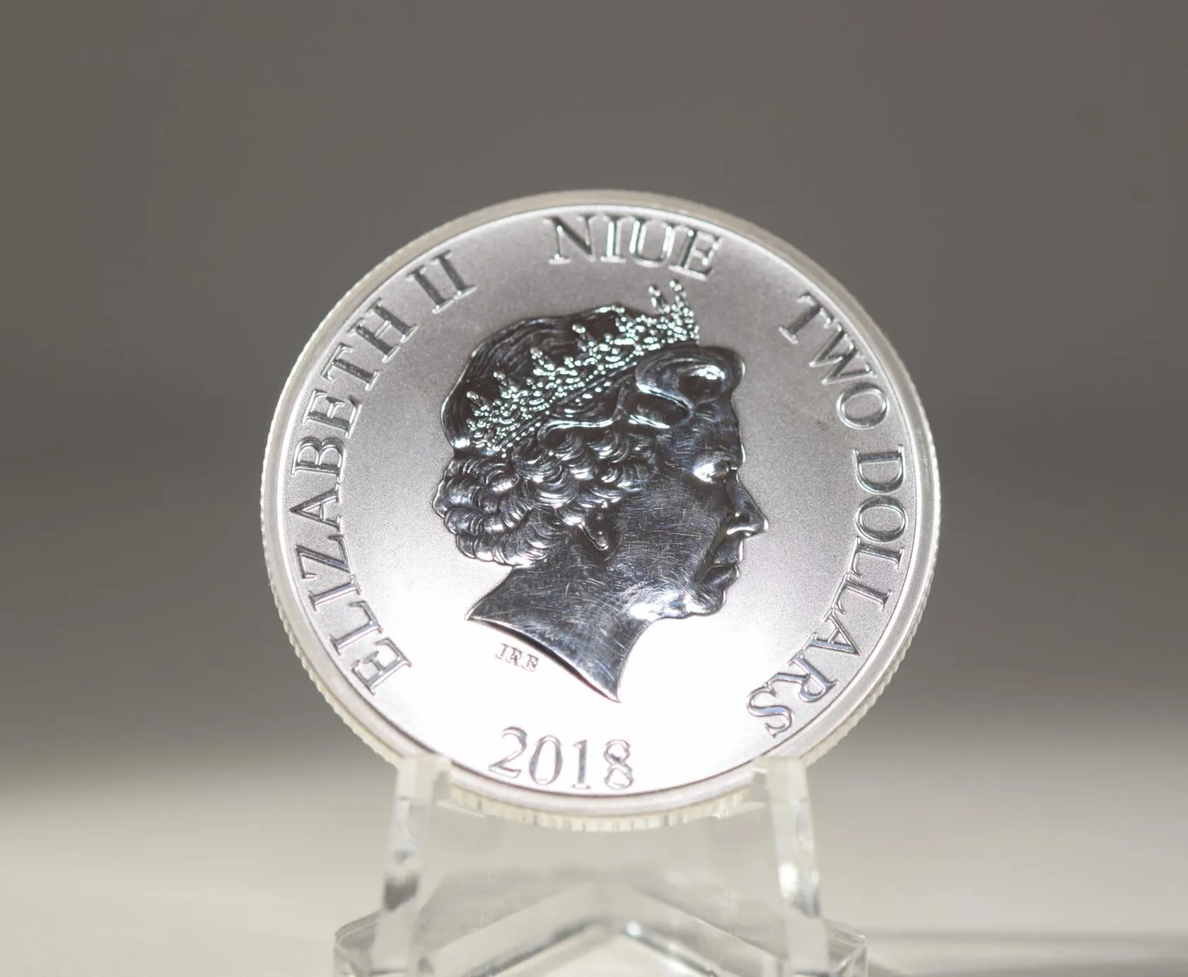 Samlarmynt, 2 dollar Elizabeth II 2018 NZD, Dart Vader motiv på ena sidan. Diameter 40mm, silver 999/1000 Vikt: 31,1 g.