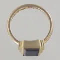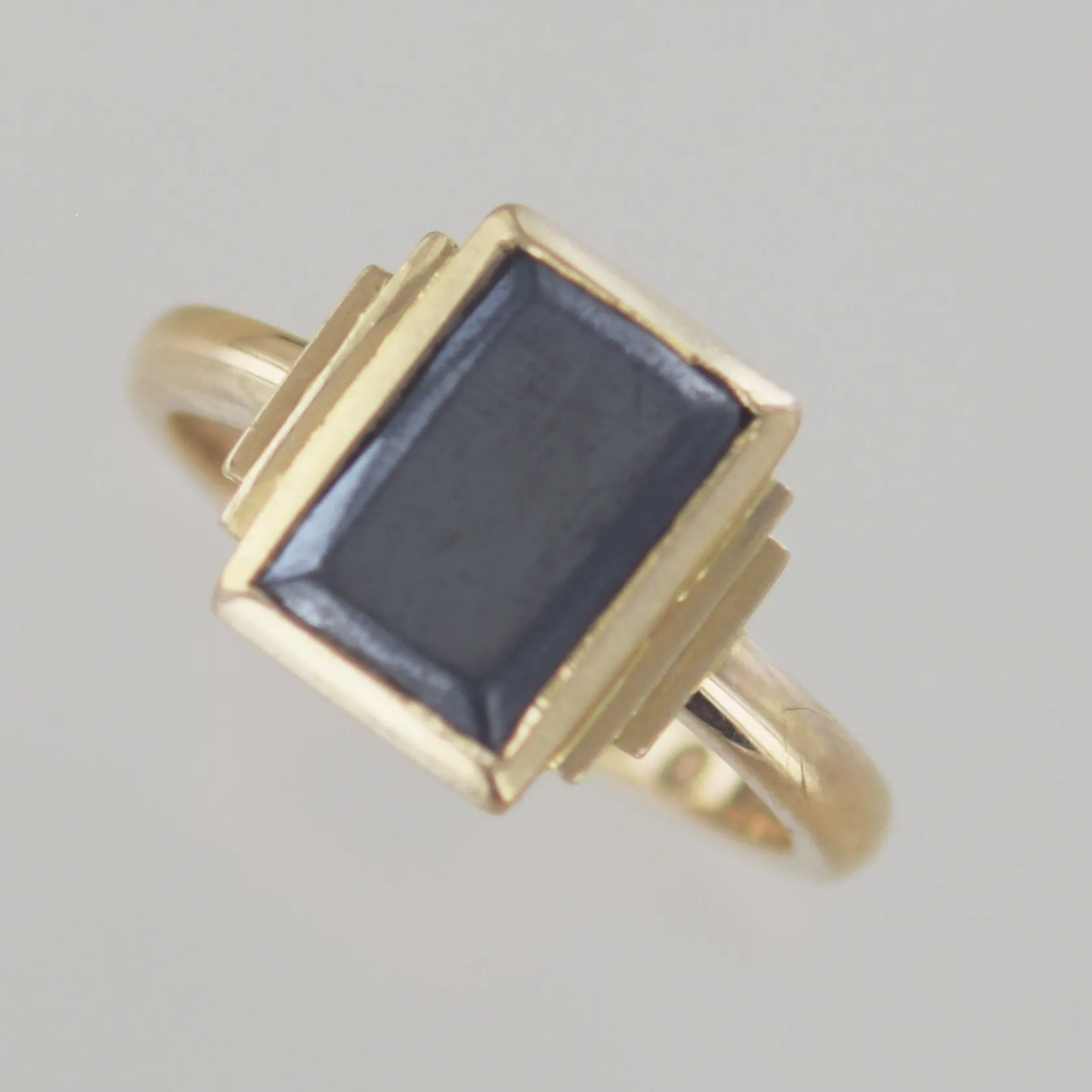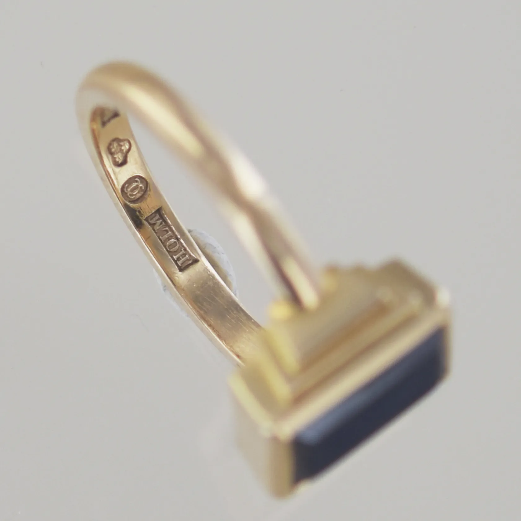 Klackring från år 1928 med sten små repig, klackens bredd 14,37-10,68 x 14,59 mm. Ø 21,75 mm, 18k, graverad Vikt: 11,2 g.