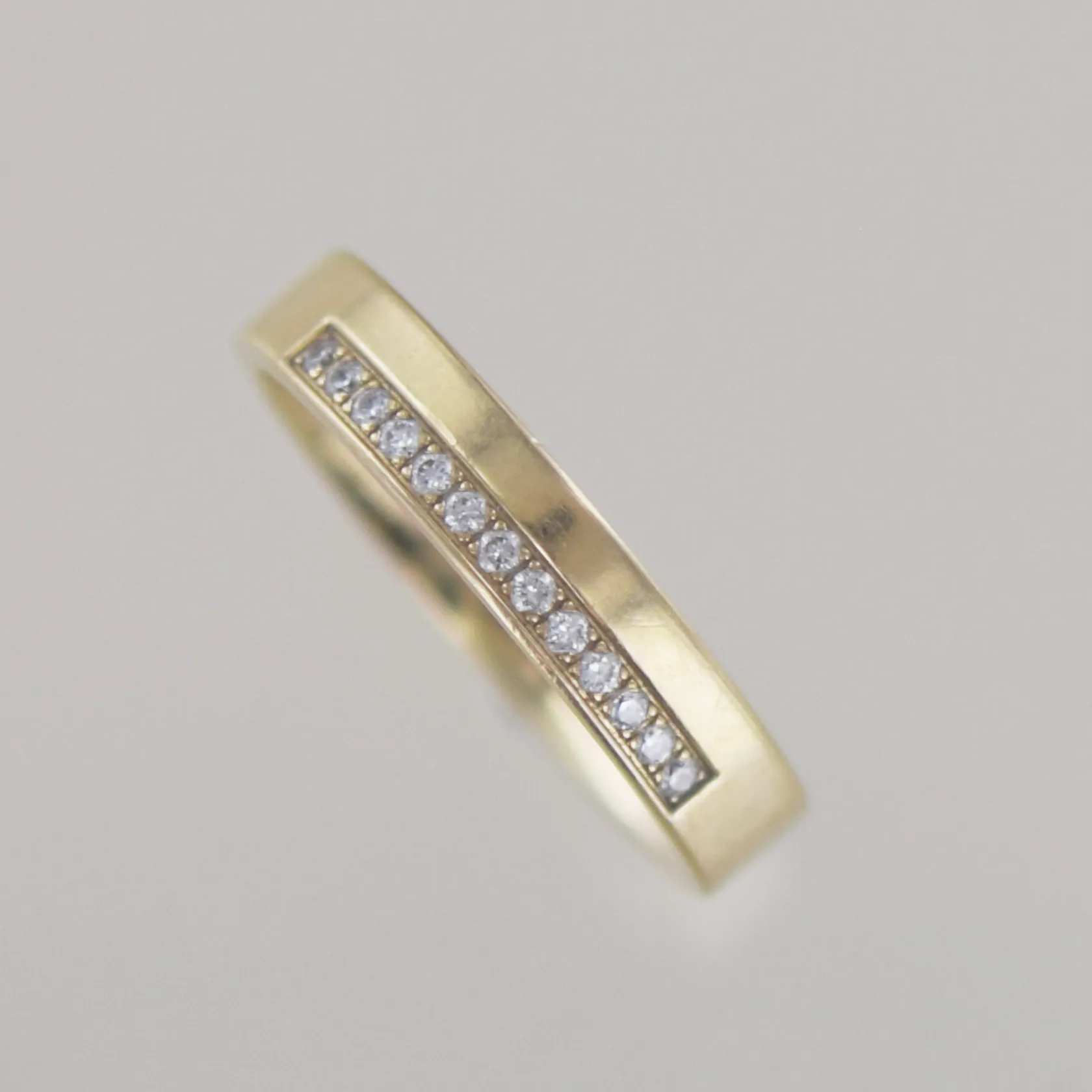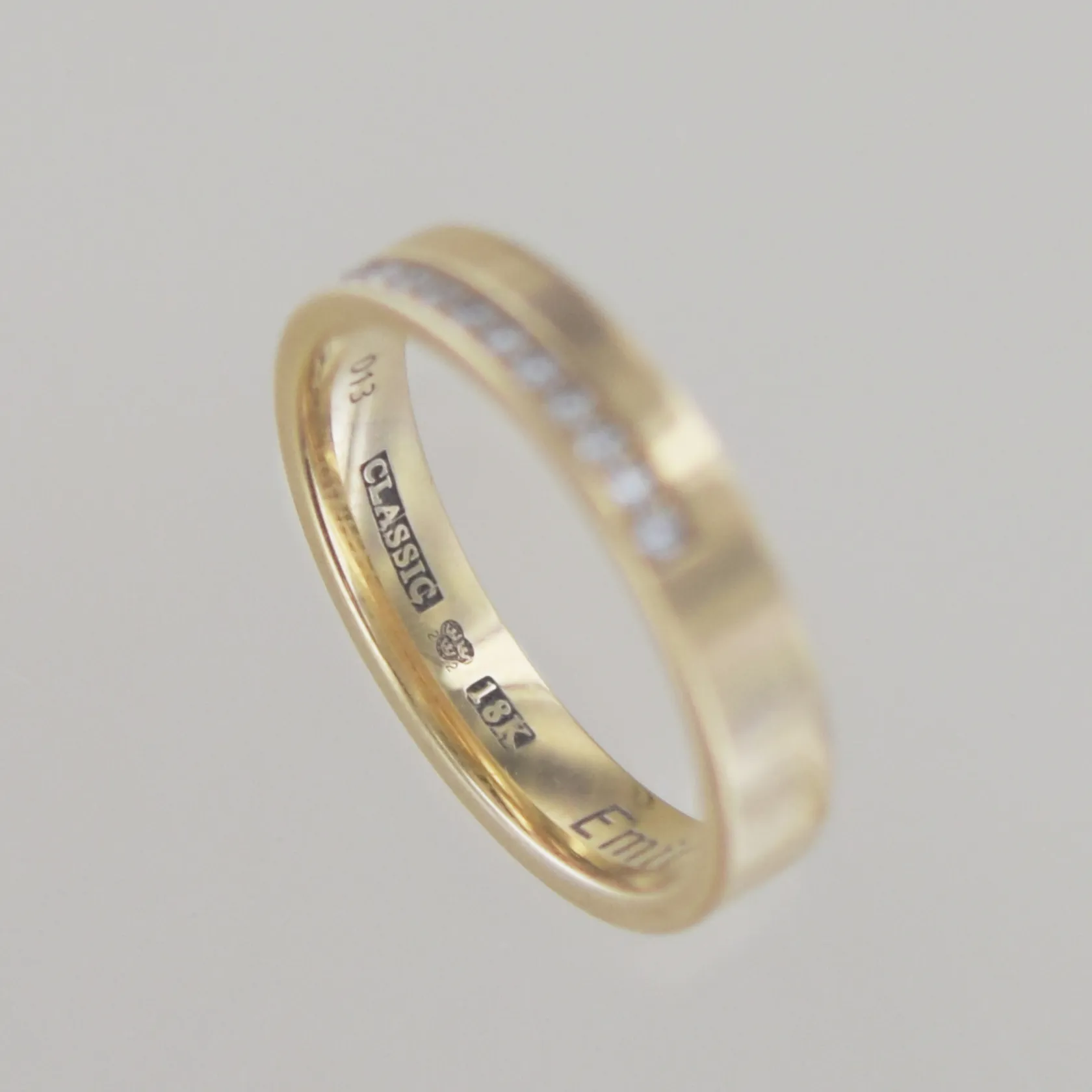 Alliansring med diamanter 0,13ct, Ø 17,5 mm bredd 4 mm. 18k Graverad förnamn/hjärta. Vikt: 5 g.