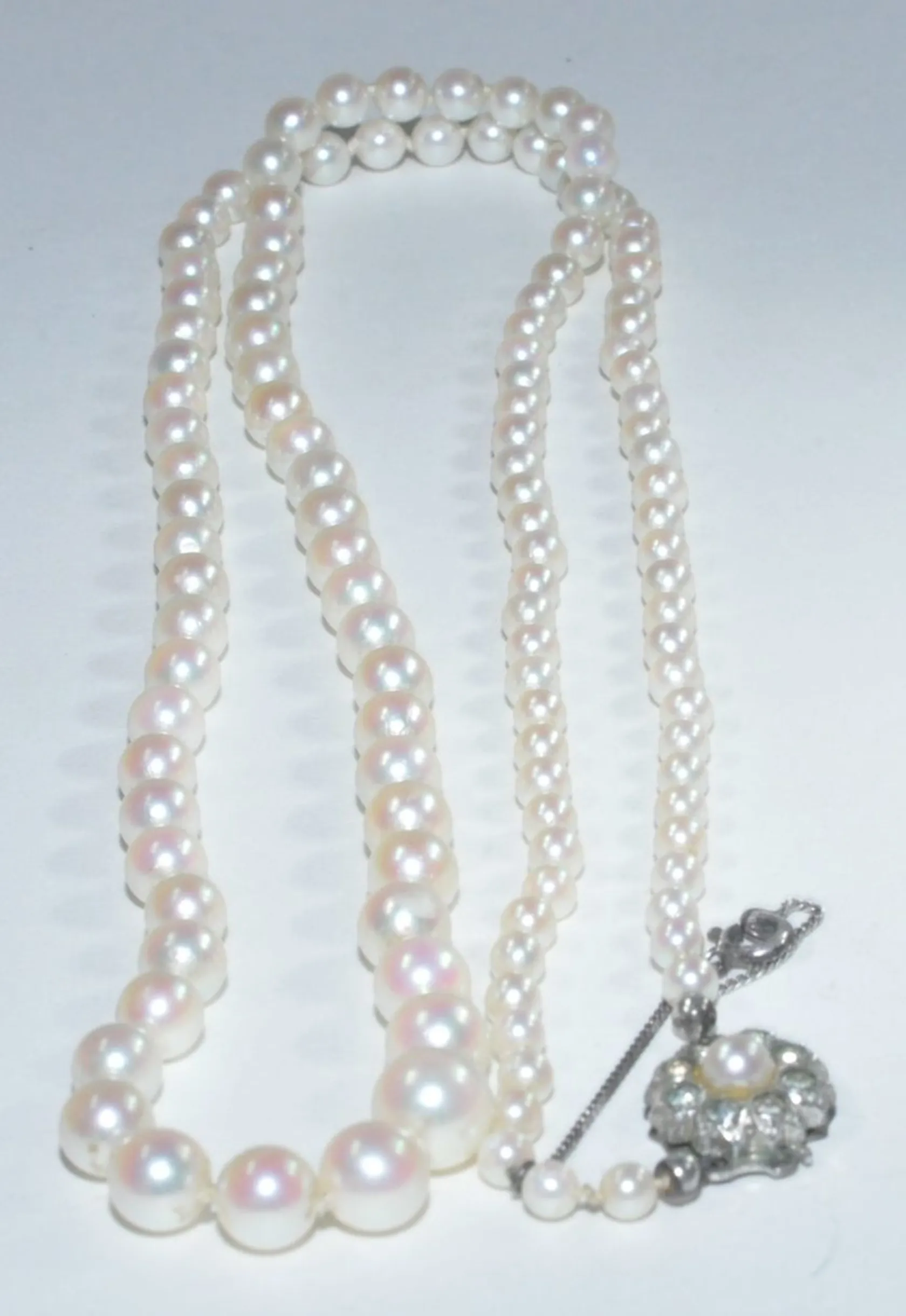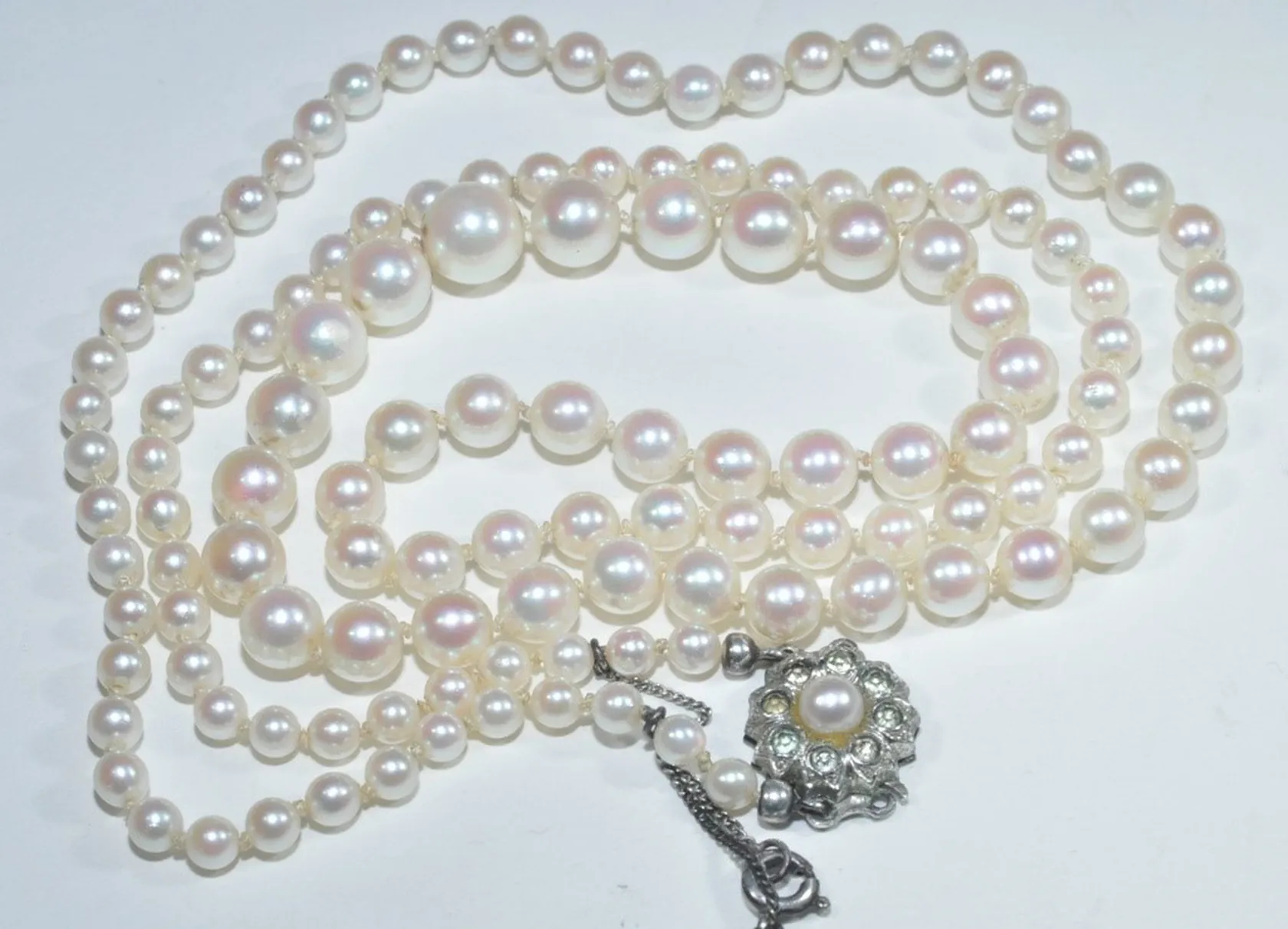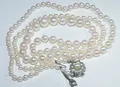 Pärlhalsband silverlås breed 4-8 mm, längd 73cm, + säkehetskedjar Vikt: 25,4 g.