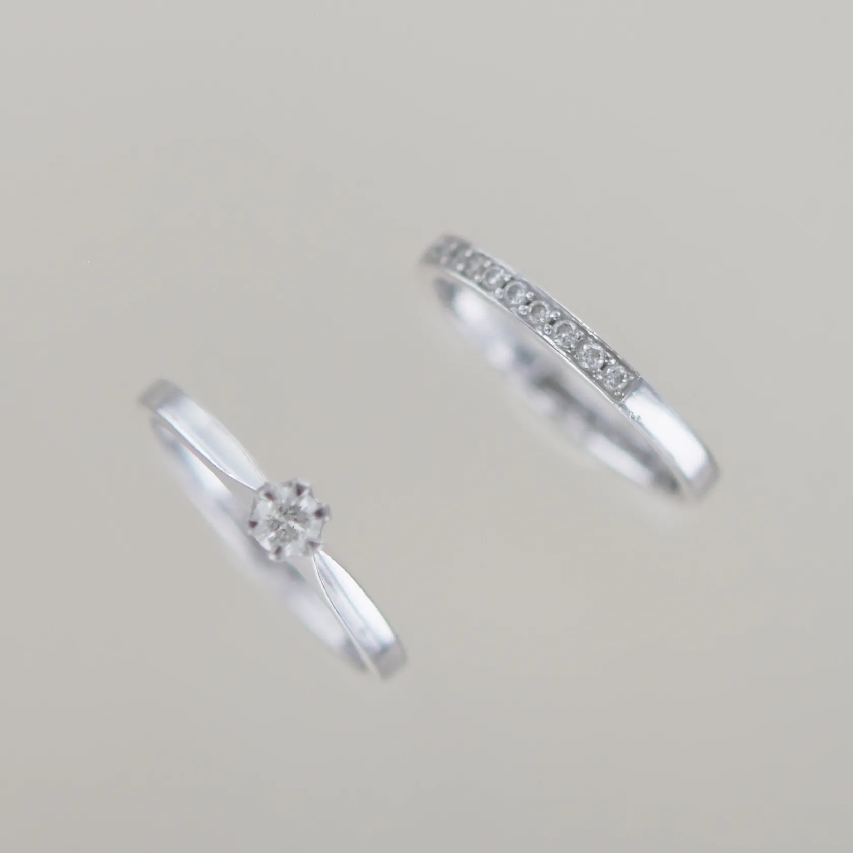 Två ringar Schalins, 1 Solitär med diamant 0,10 ct graverad, 1 Alliansring 0,12 ct, Ø 15,25 mm båda, vitguld 18k Vikt: 4 g.