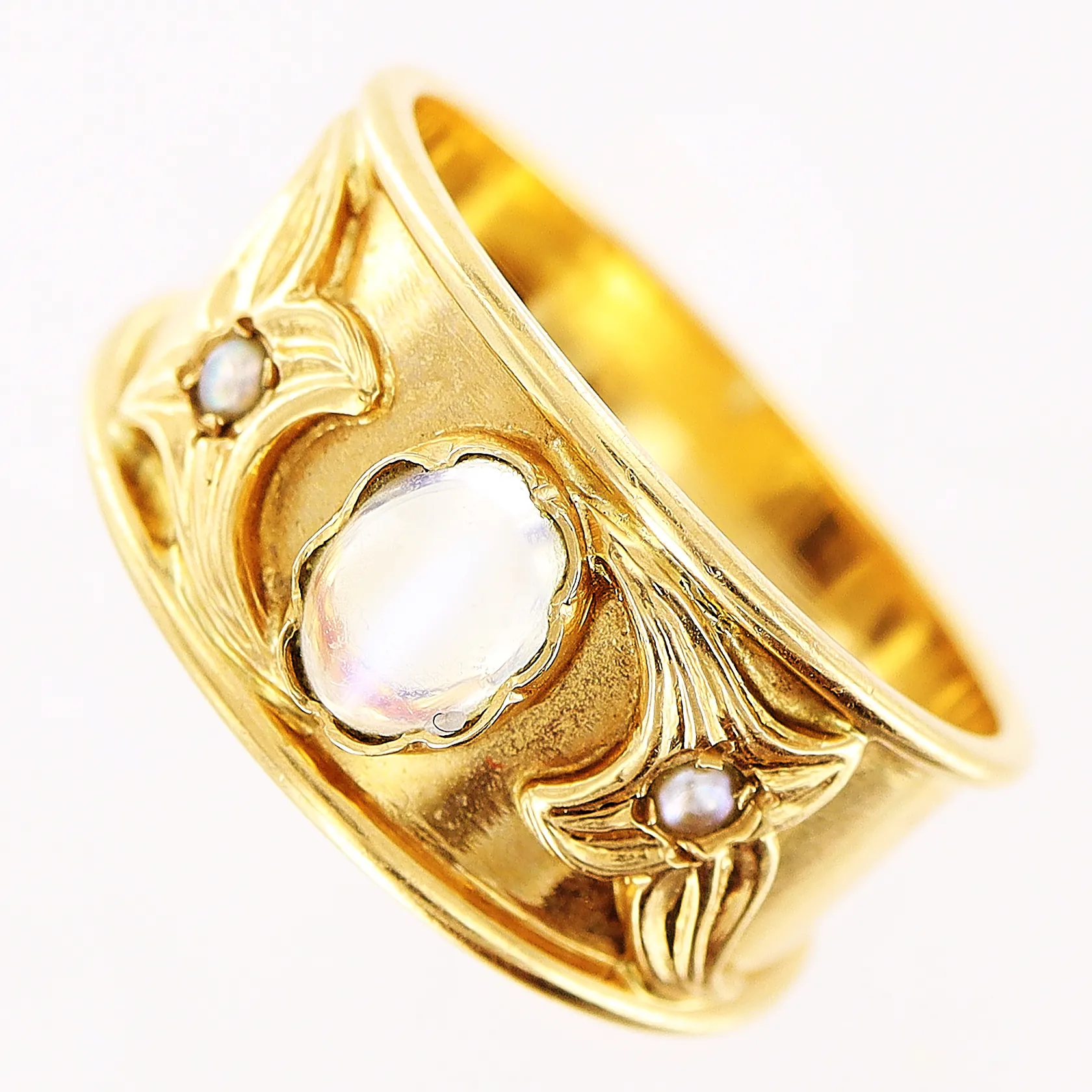 Ring, cabochonslipad månsten, odlade pärlor stl 16¼, bredd 2-9mm, 18K. Vikt: 3,7 g.