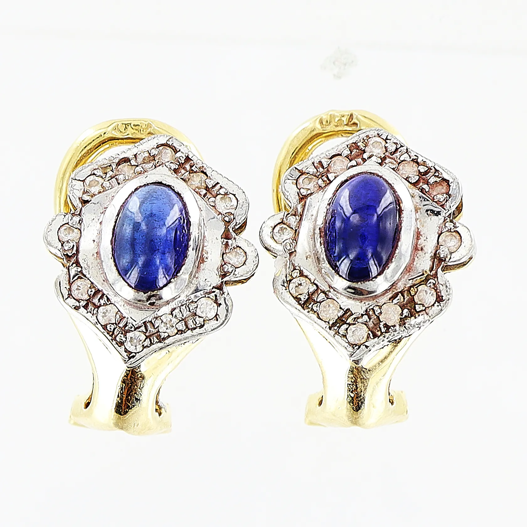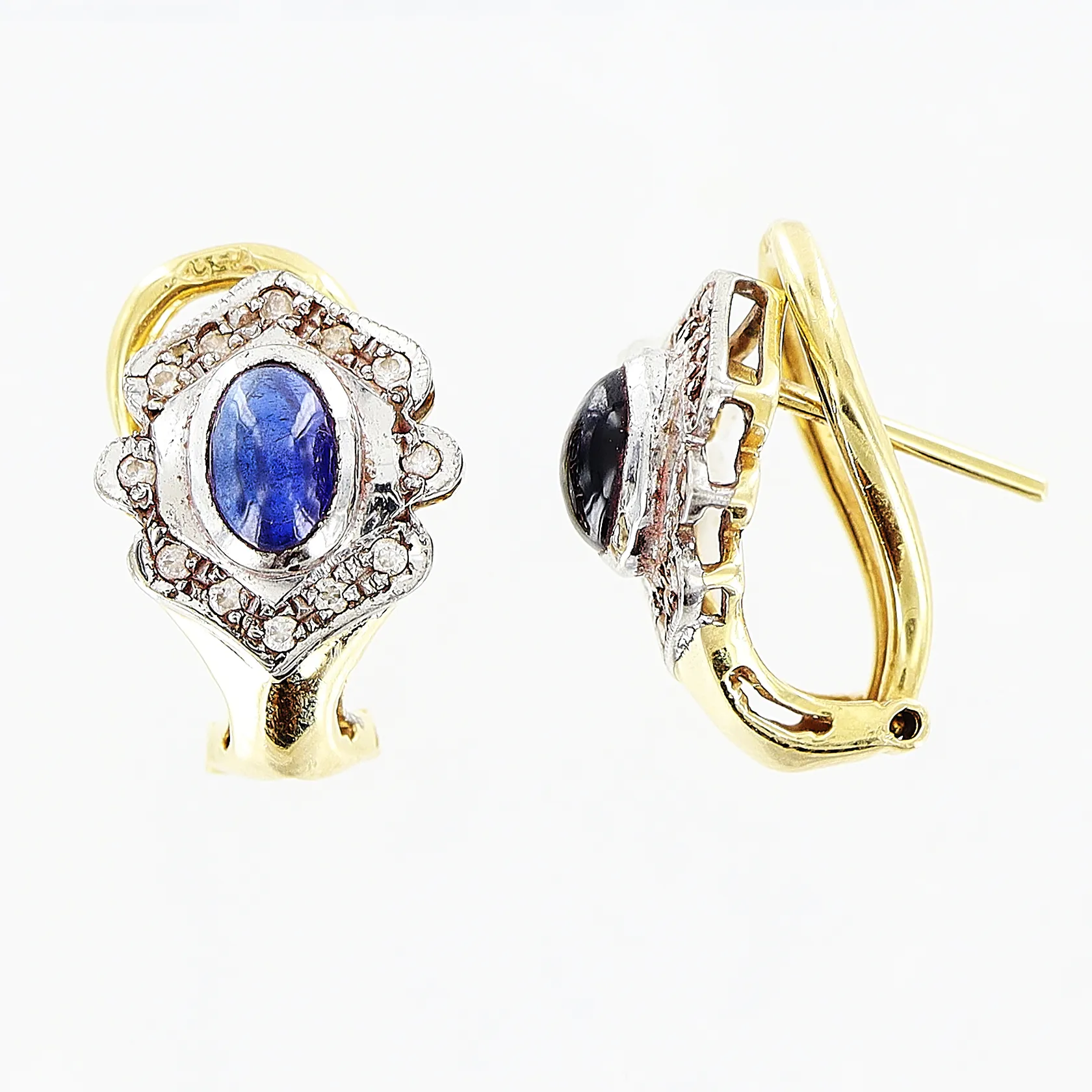 Ett par örhängen, vita/blå stenar, stift med låsclips, skeva, 18K. Vikt: 5,6 g.
