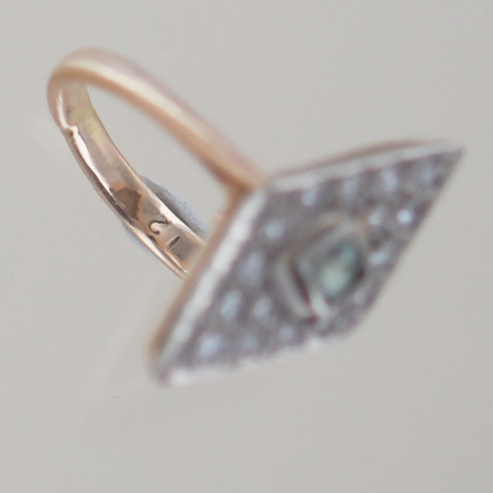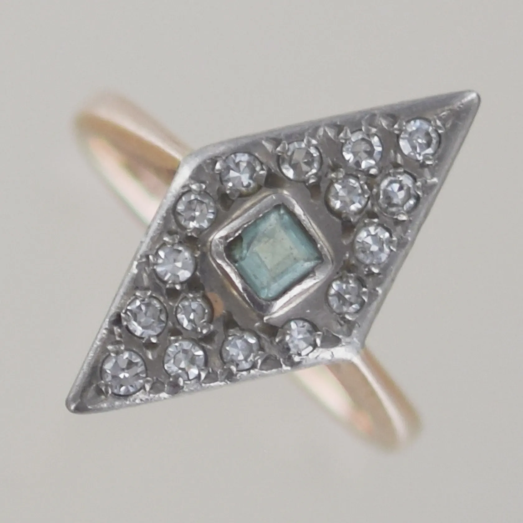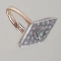 Ring med 16 diamanter 0,12ct,, Ø 16mm, 14k. Saknas en liten bit av den gröna stenen Vikt: 5,1 g.