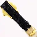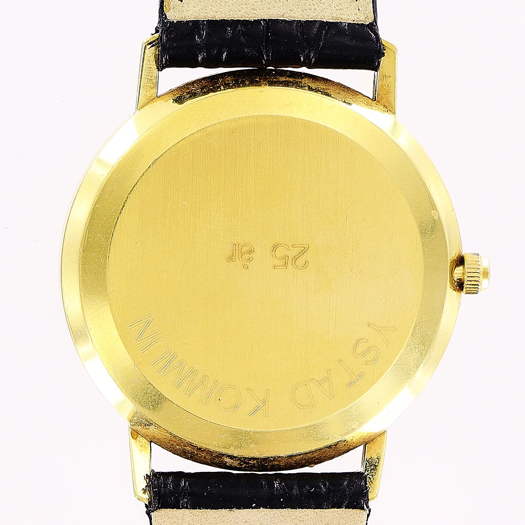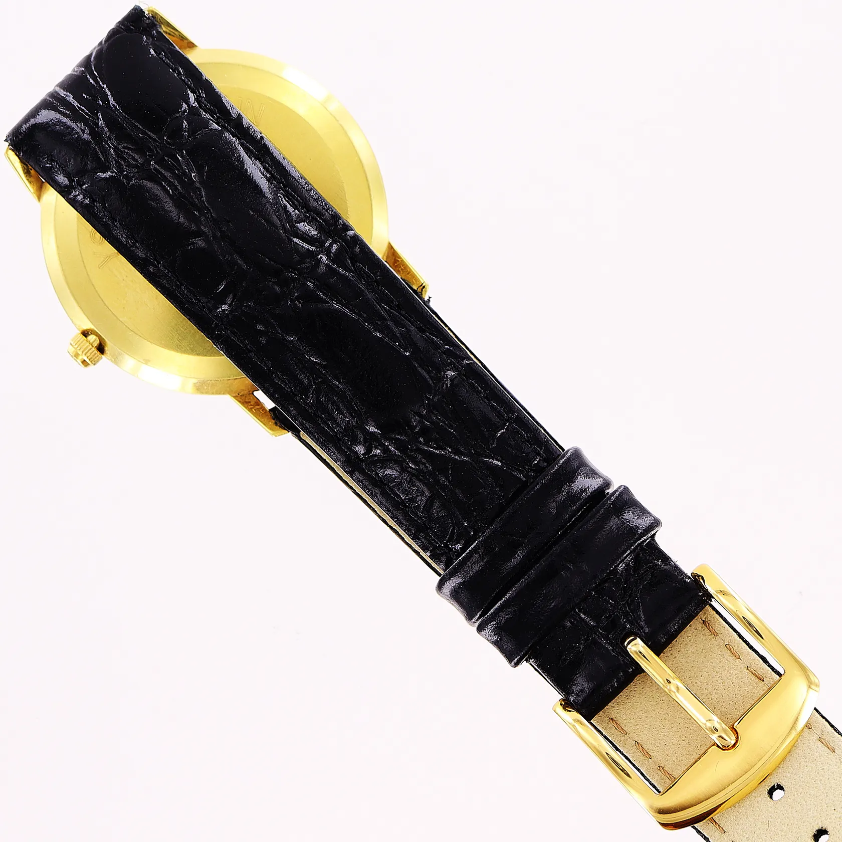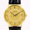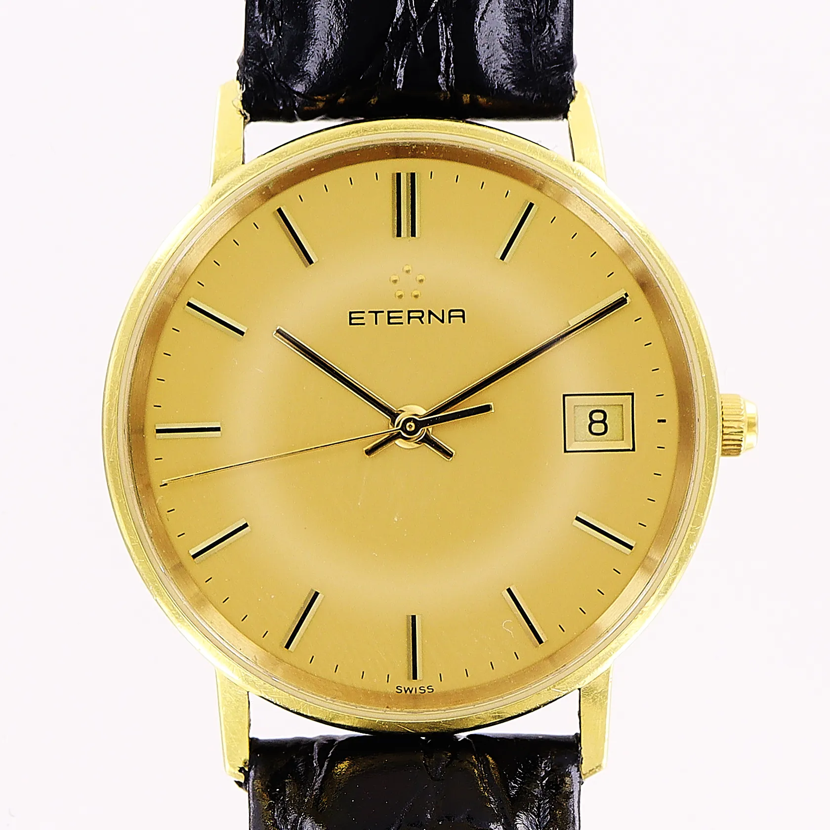 Herrur Eterna, 18K, quartz, Ø33mm, guldfärgad urtavla, datum sekundvisare, gravyr, svart läderband Rocket, inga tillbehör.