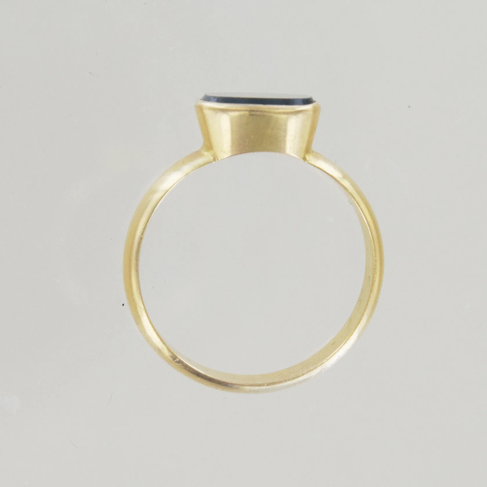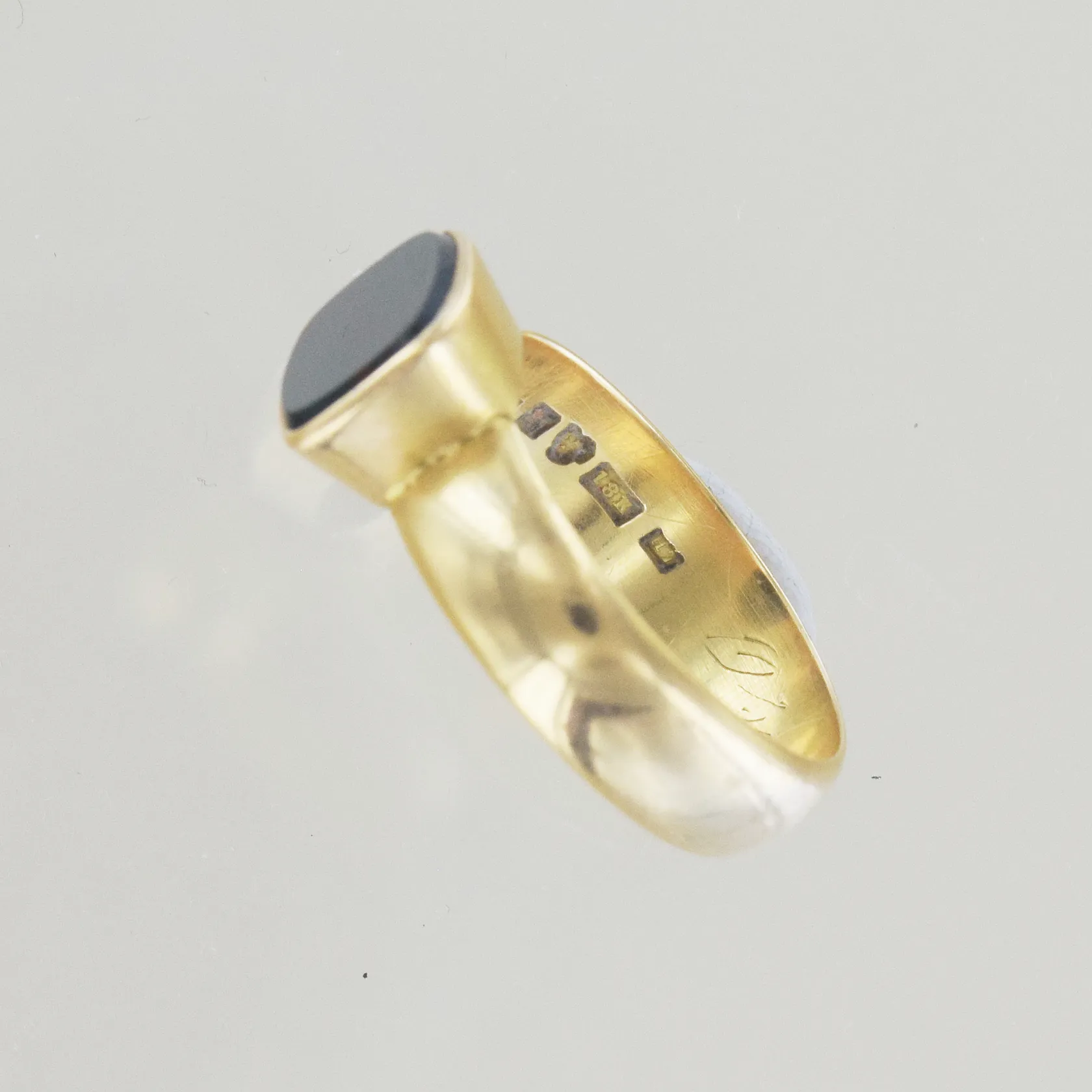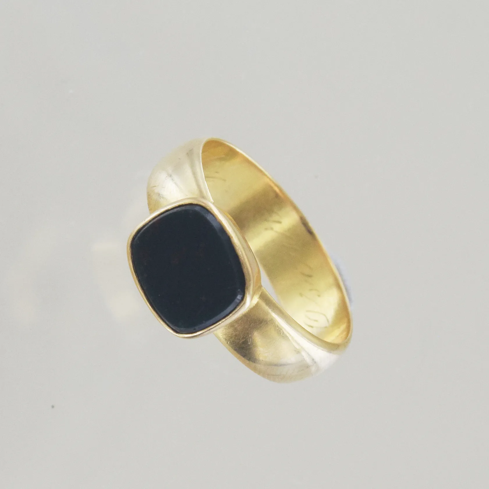 Ring med svart sten, Ø 20½, bredd 6-10 mm, tunn gravyr, 18K Vikt: 7,6 g.