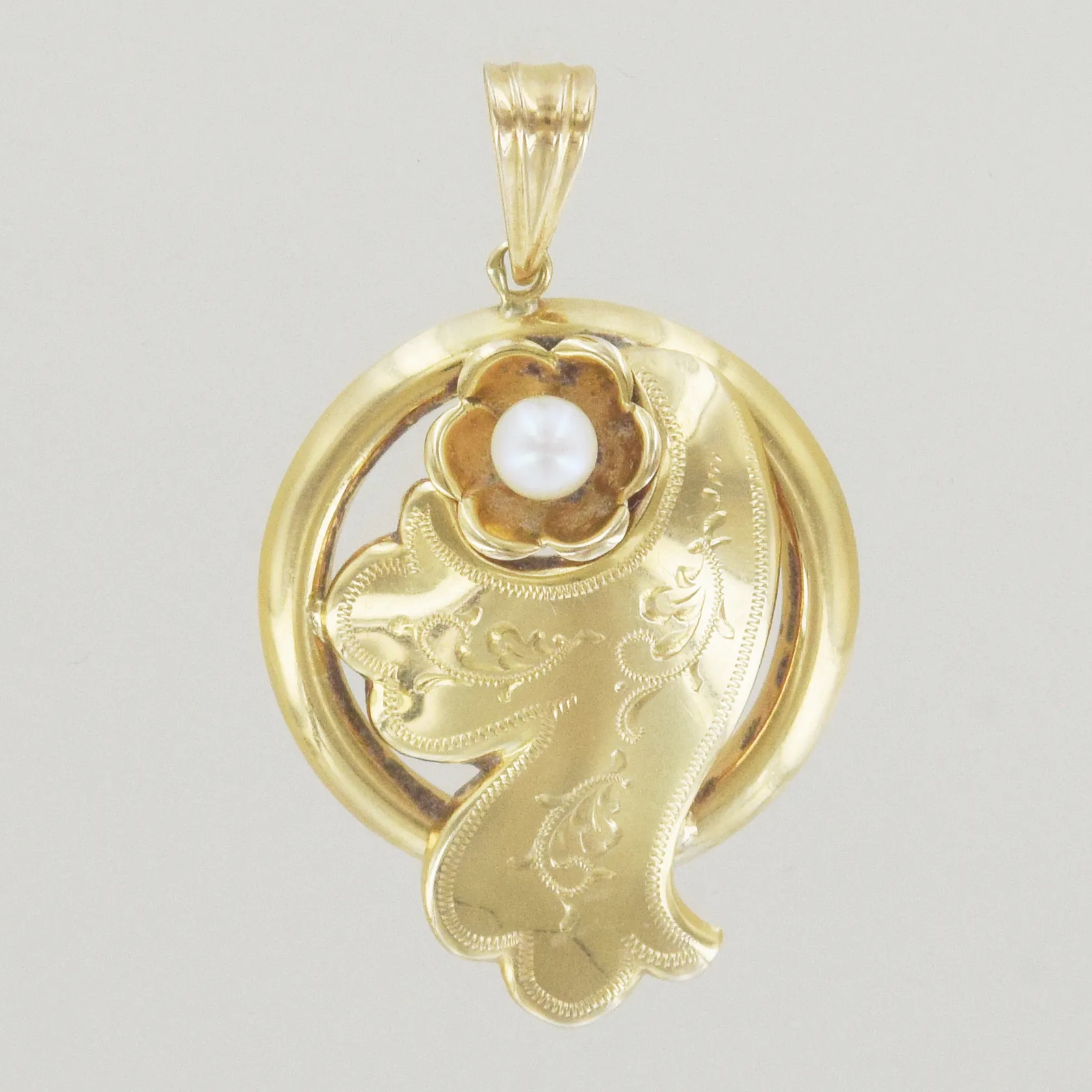 Hänge med pärla, längd 4 cm, bredd 2,5 cm, 18K Vikt: 3,5 g.