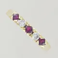 Ring med diamanter 2 x 0,05ct + rubiner, Ø 18 mm, bredd 3,4 mm, 18K Vikt: 4,4 g.