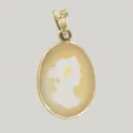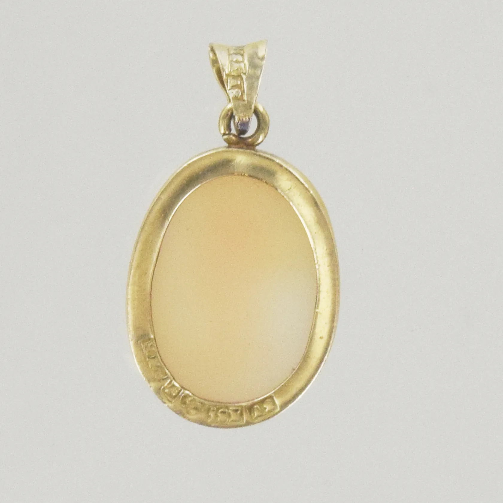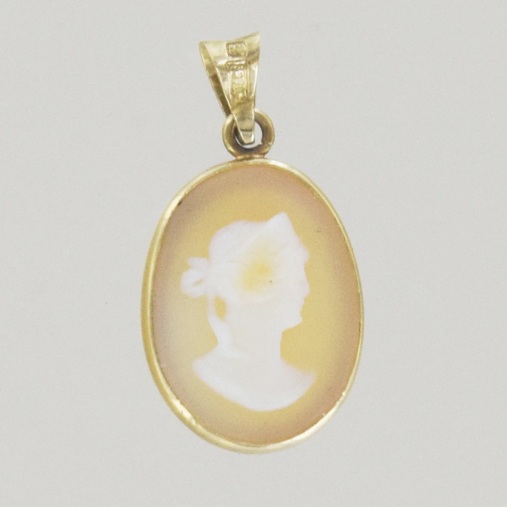 Hänge camé, längd 2,3 cm, bredd 1,2 cm, lite intryckt ögla, 18k Vikt: 1,2 g.