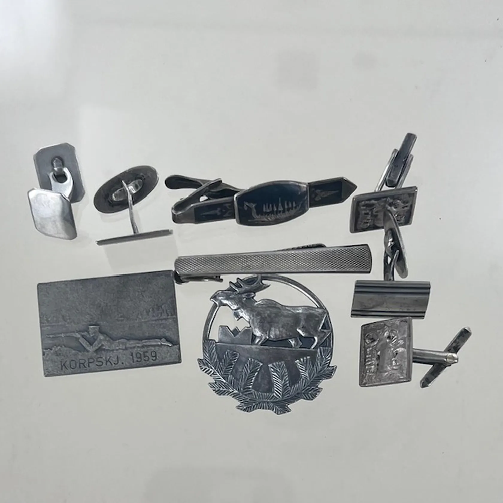 Manschettknappar/brosch silver, 39,2 gr + slipsklämma/medalj ej silver, 20,1 gr