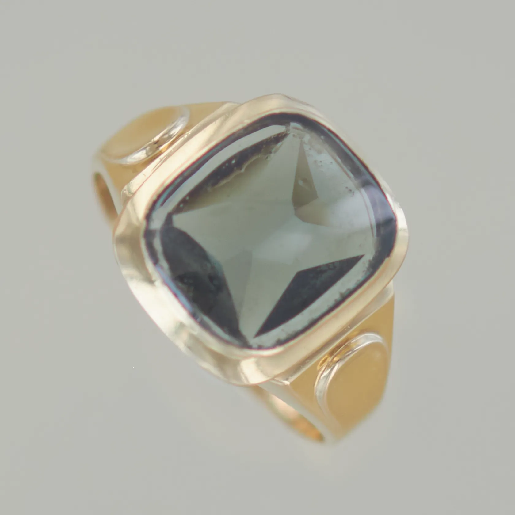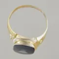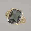Ring med grön sten, Ø 21 mm, bredd 16 mm, graverad lite ojämn skna, 18K Vikt: 5 g.