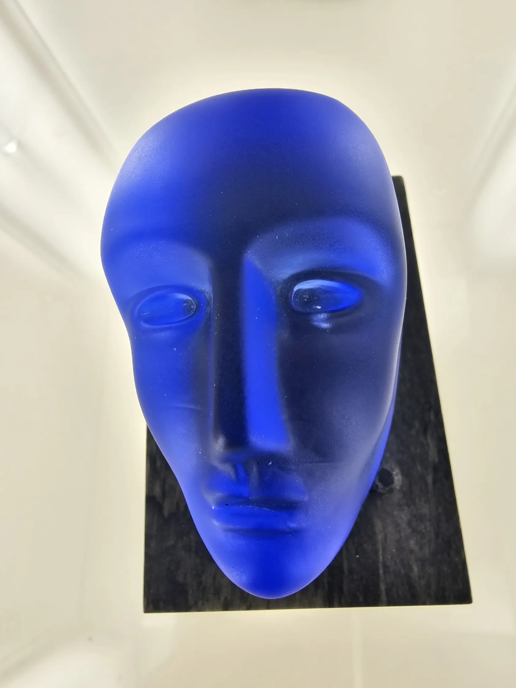 Glashuvud Bertil Vallien, höjd 7 cm, Kosta Boda 2099859 + sockel i trä. Skickas med postpaket.