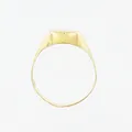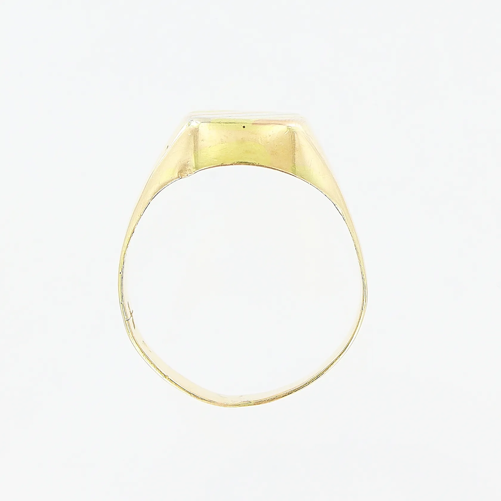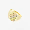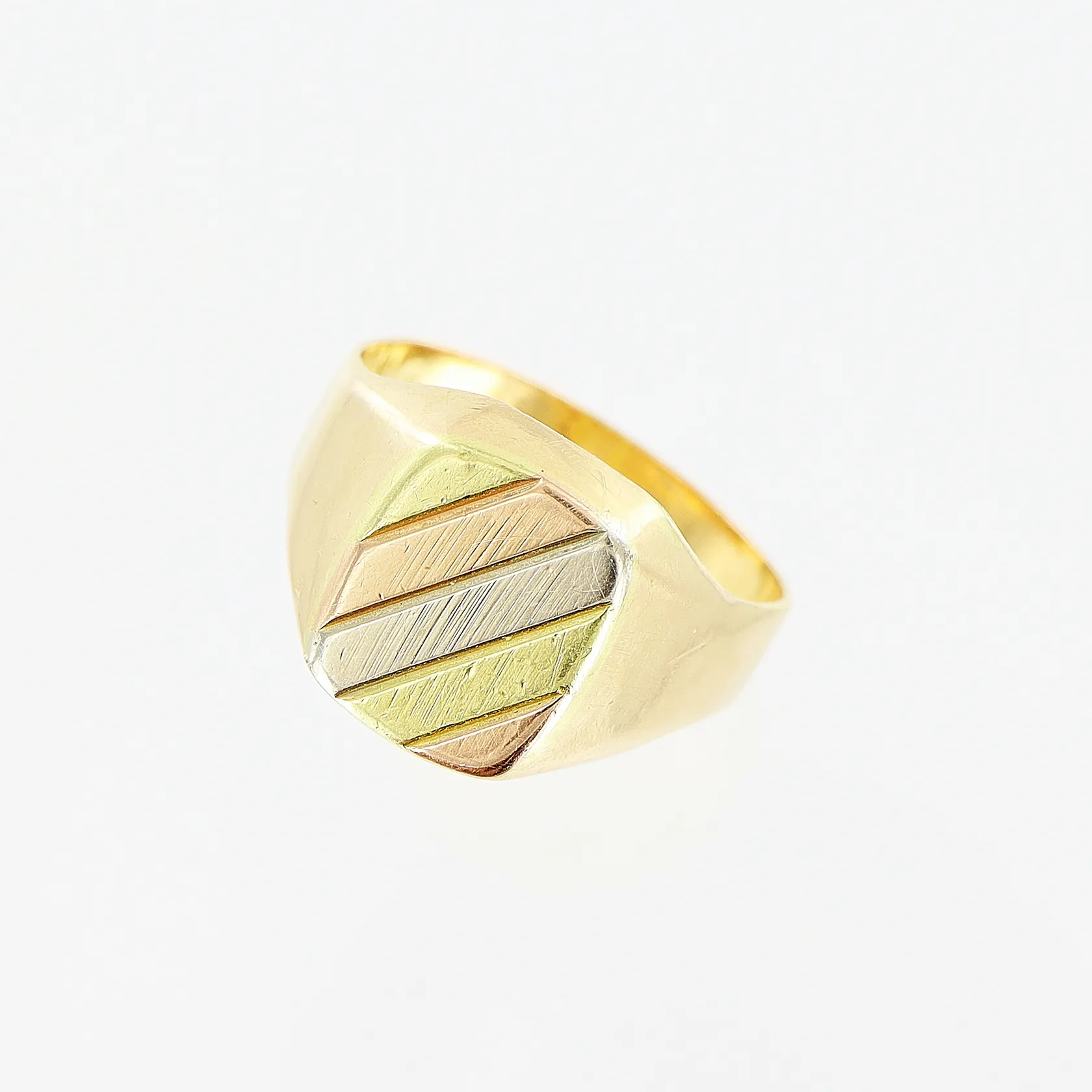 Klackring, vit/gul/rödguld, stl 18, bredd 3,5-13mm, skev skena, smärre bucklor, 18K. Vikt: 4,7 g.