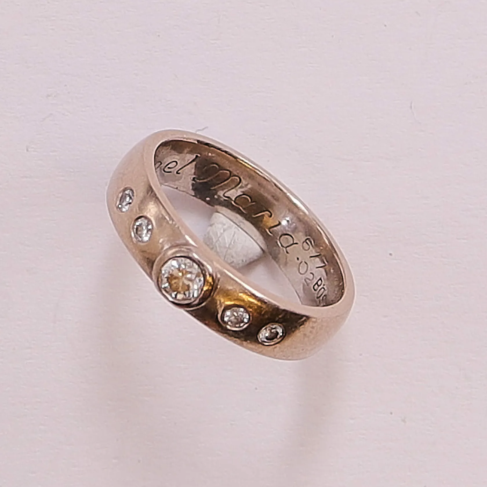 Ring, diamanter (1x 0,15ct, 4x 0,02ct), Ø16, bredd:4mm, GRAVERAD 18K 5,4g. Vikt: 5,4 g.
