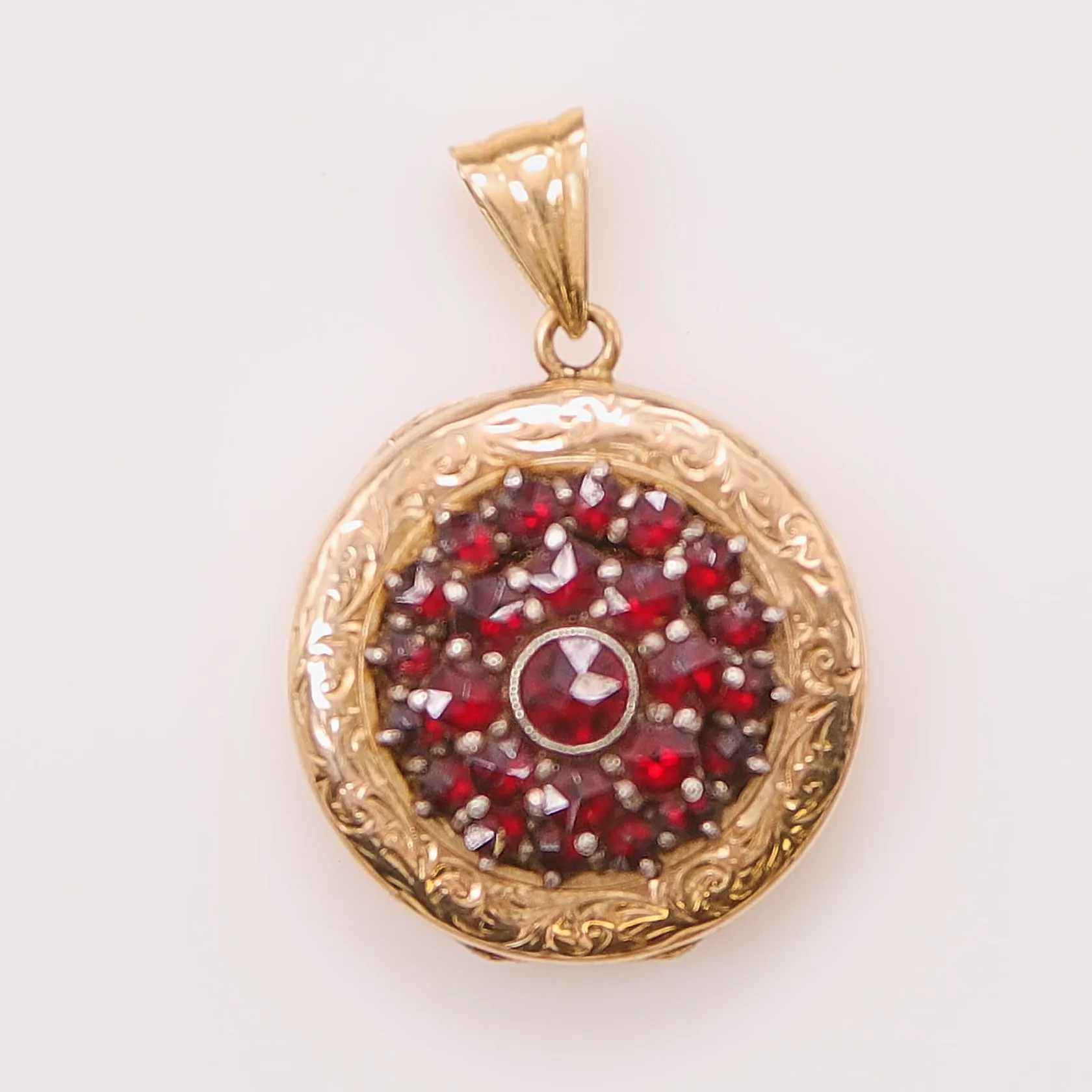 Hänge, granater, Ø20mm, omgjord boett från mormorsur, öppningsbar, 14K 5,5g. Vikt: 5,5 g.