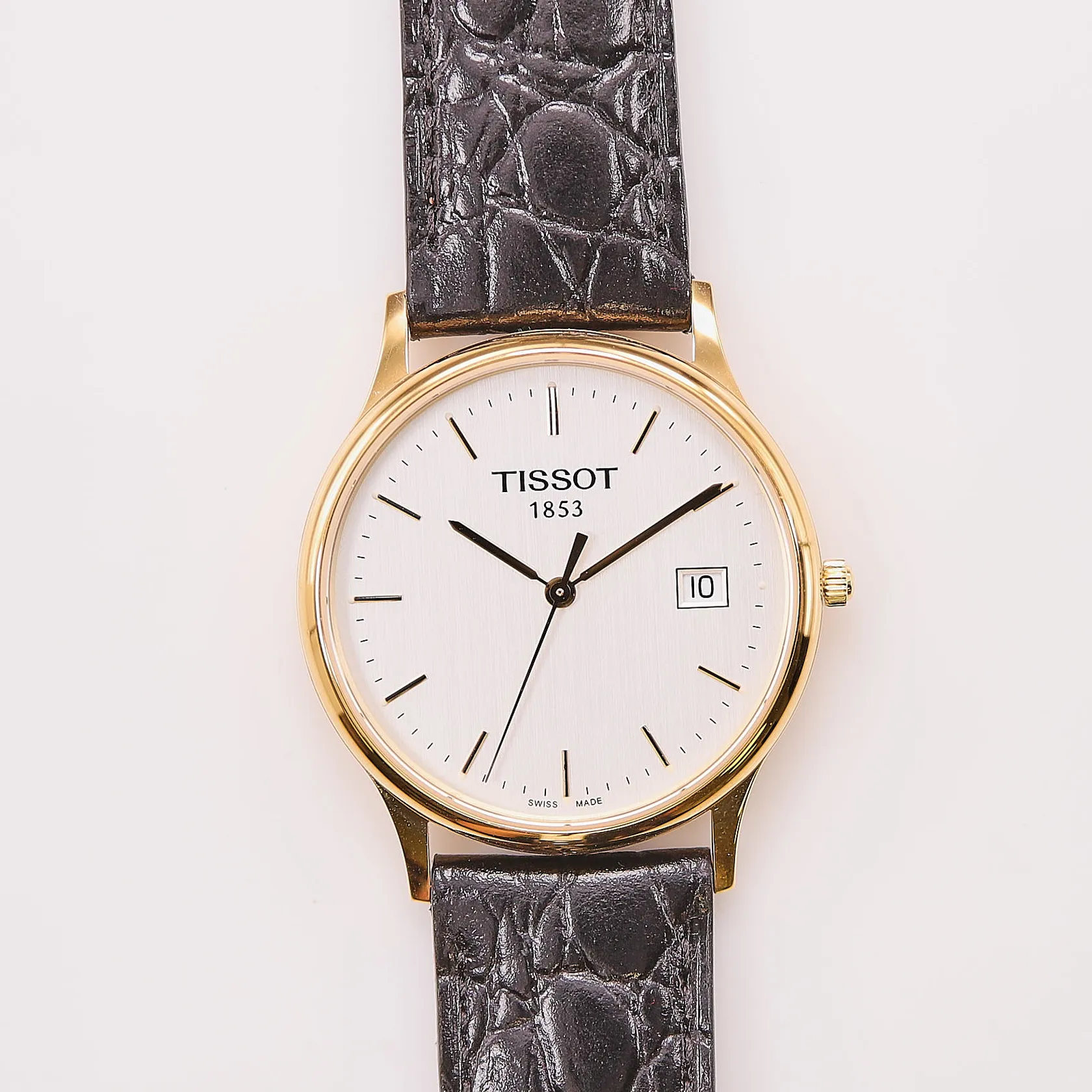 Herrur Tissot 18K, 33mm, quartz, gravyr, batteribyte krävs, fint skick, originalbox.
