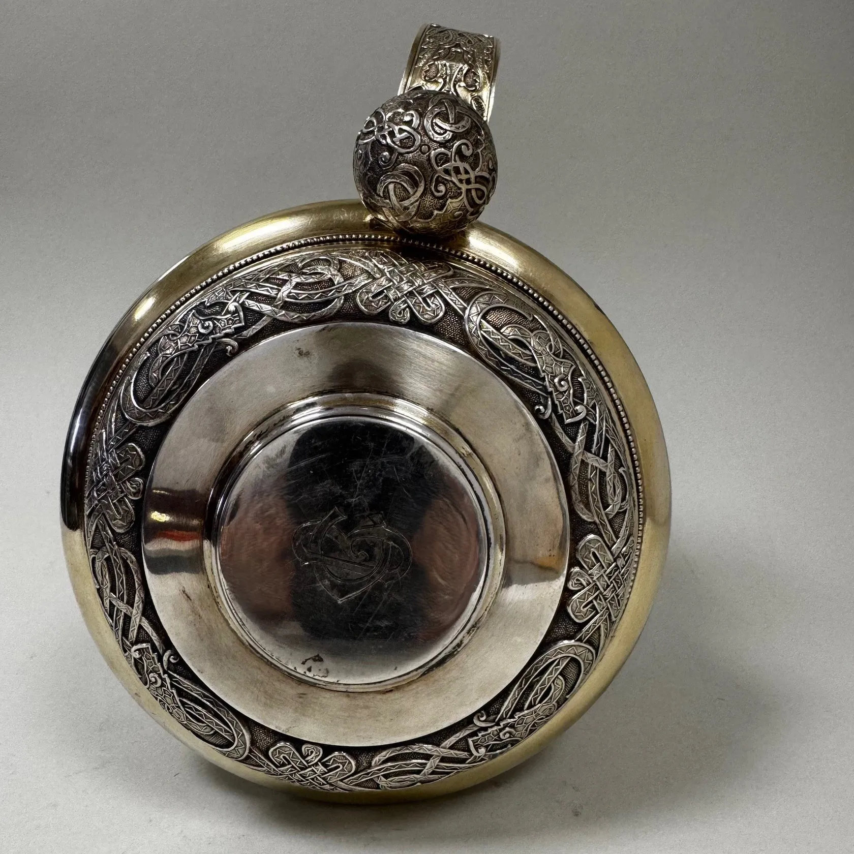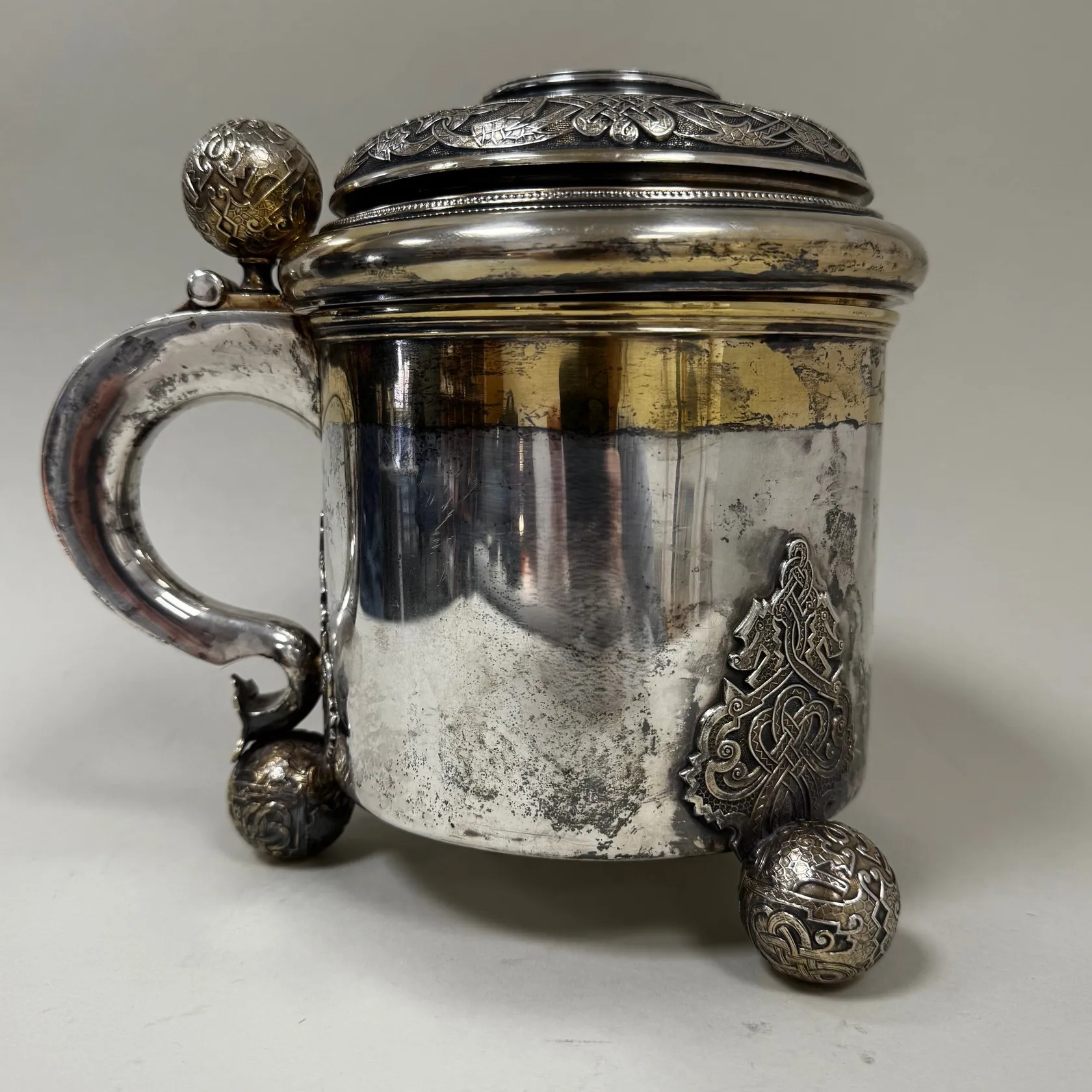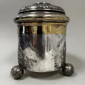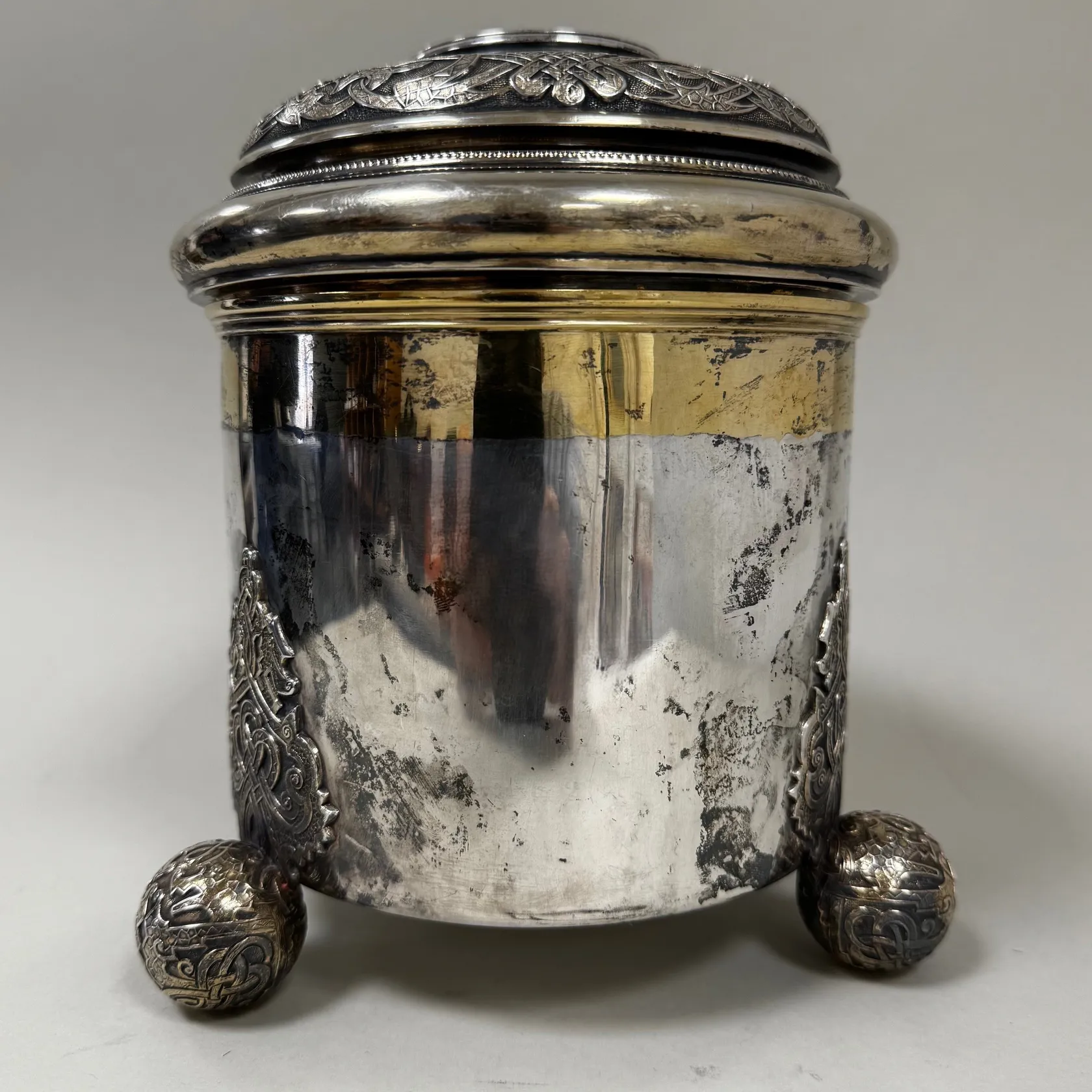 Ölstop på kulfötter, Karl Anderson 1897, barock stil, förgylld insida, punsad dekor, monogramgravyr på lock, höjd ca 20cm Ø17cm, 830/1000 Silver 903,2g. Vikt: 903,2 g. Skickas med postpaket.