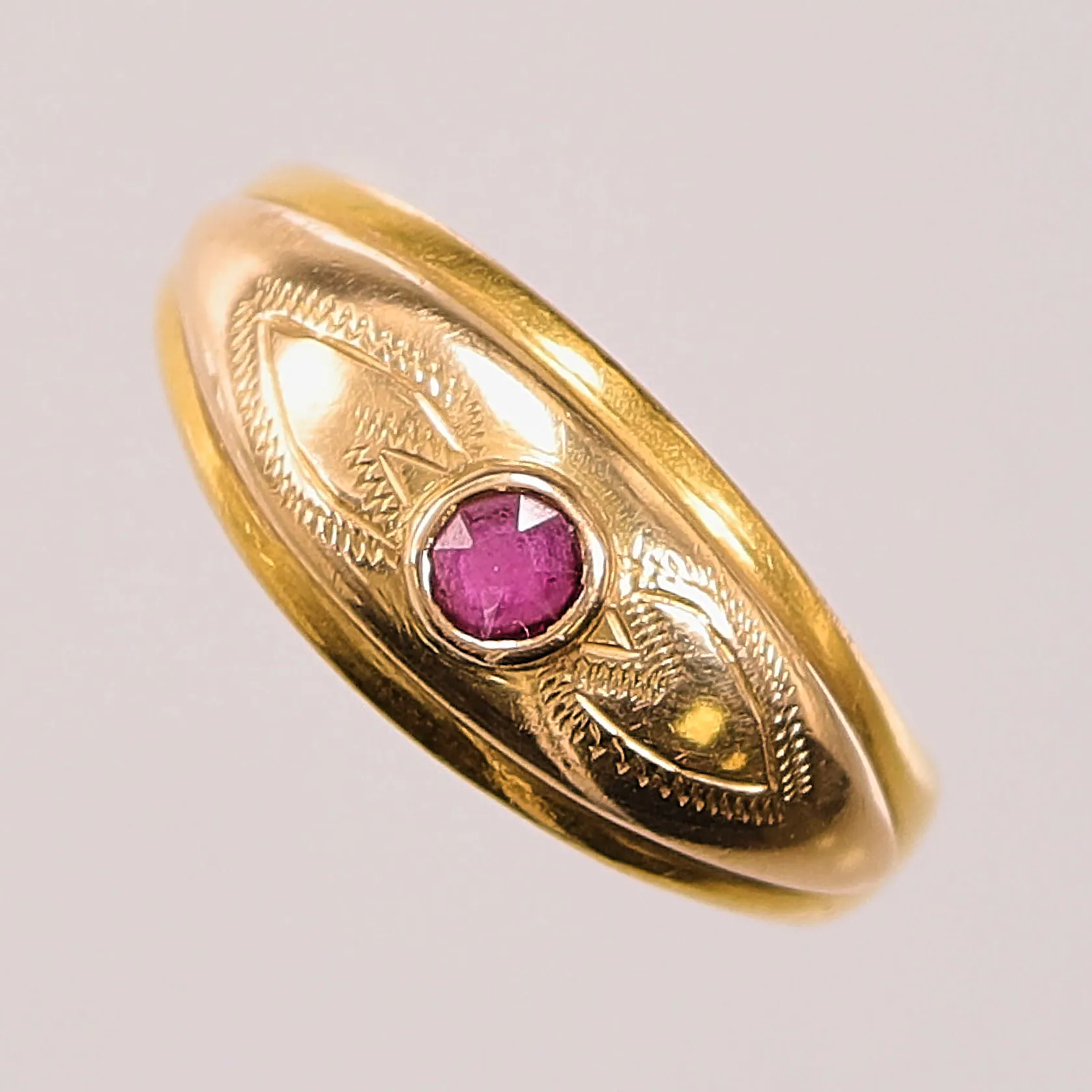 Ring, röd sten, Ø17, bredd:9mm, gravyr, fattning i 18K, skenan i 23K 5,6g. Vikt: 5,6 g.
