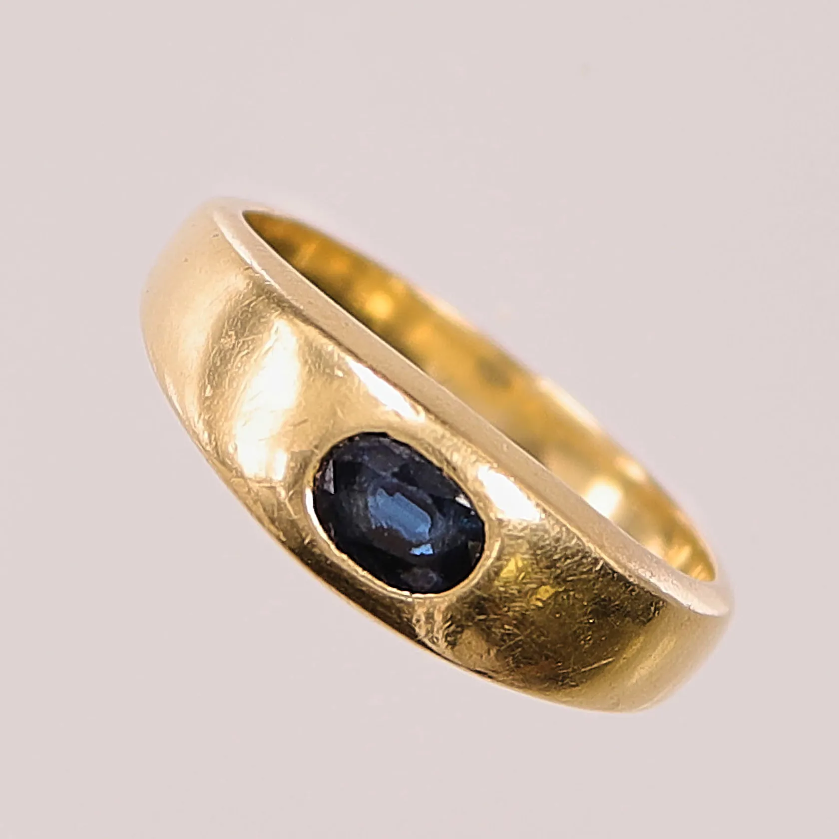 Ring med safir 0,29ct enligt gravyr, Ø17¼, bredd:7mm, 18K 6,2g. Vikt: 6,2 g.
