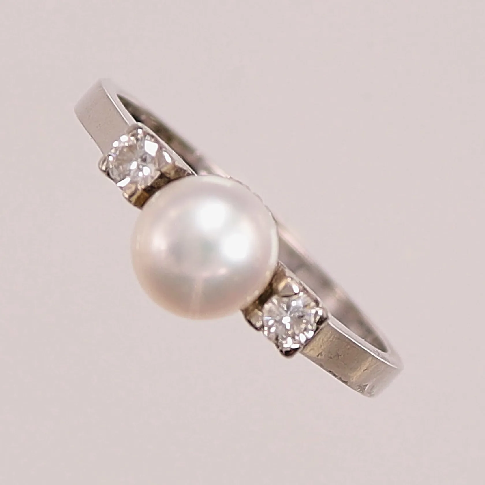 Ring, 2x diamanter 0,15ctv enligt gravyr, Ø17, pärla ca 6mm, 18K 3g. Vikt: 3 g.