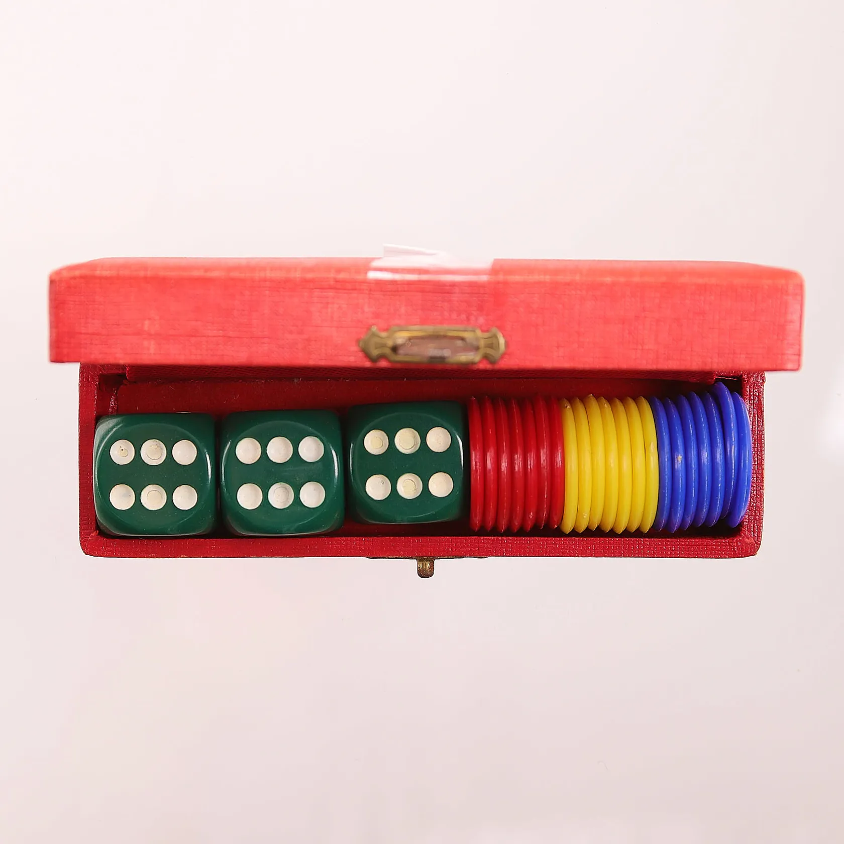 Tärningsspel, 3x tärningar samt markörer markerade "20", etui.