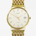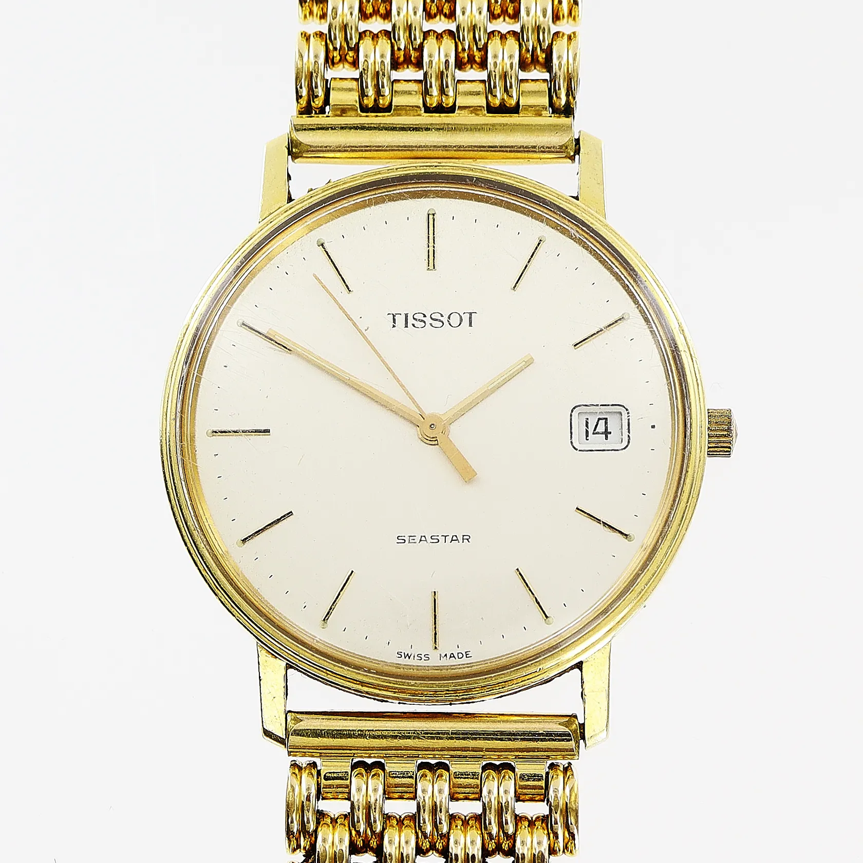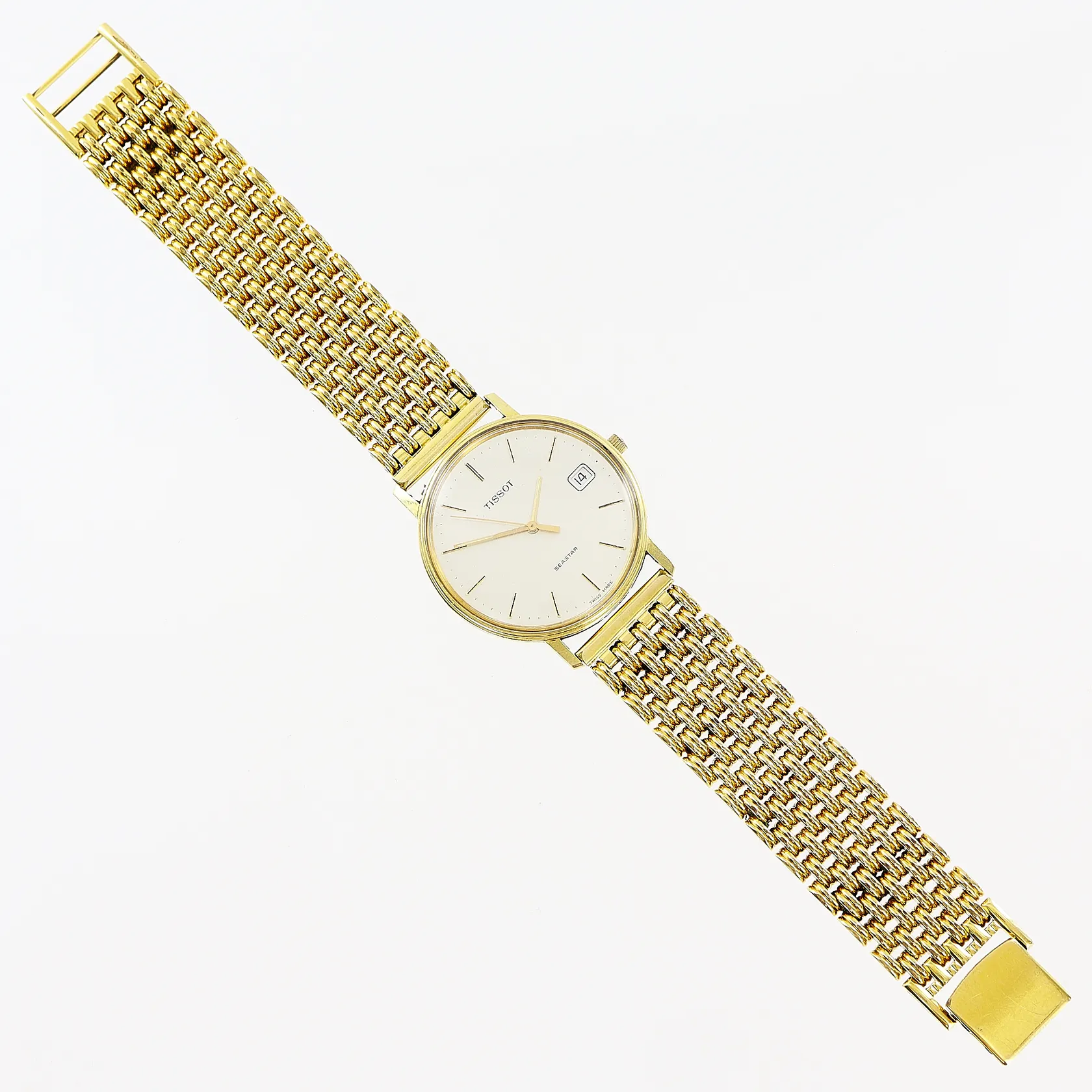 Herrur Tissot, 18K, quartz, Ø34mm, datum, sekundvisare, fungerar ej, gravyr, länk i gulmetall 19,5cm, bruttovikt 78,5g, inga tillbehör.