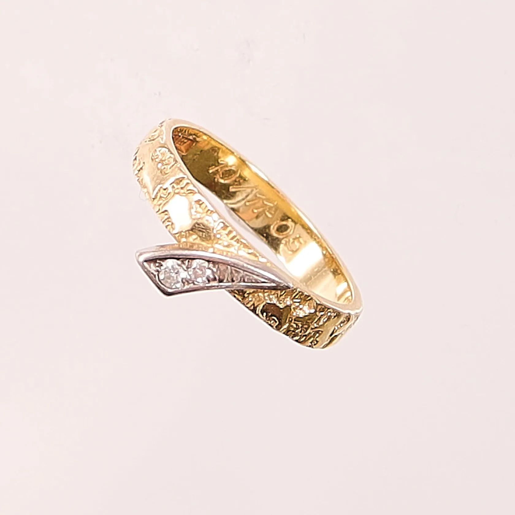 Ring, diamanter 2x ca 0,05ctv, Ø18, bredd:6mm, gravyr, 18K 4,6g. Vikt: 4,6 g.