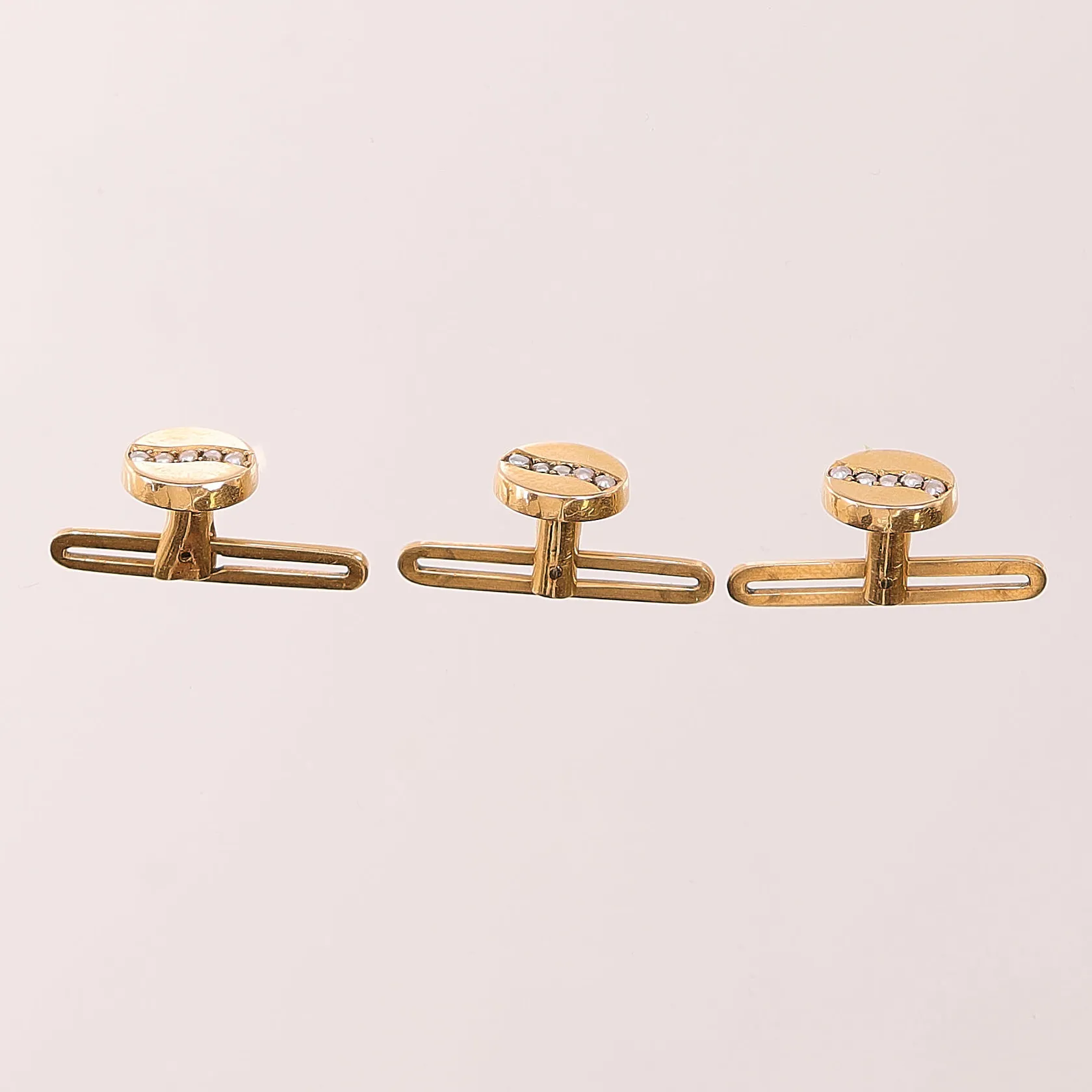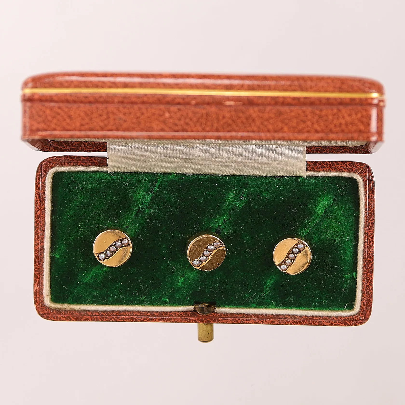 3 Skjortknappar med fröpärlor, Ø8,4mm, tillhörande etui, 18K, 3,7g. Vikt: 3,7 g.
