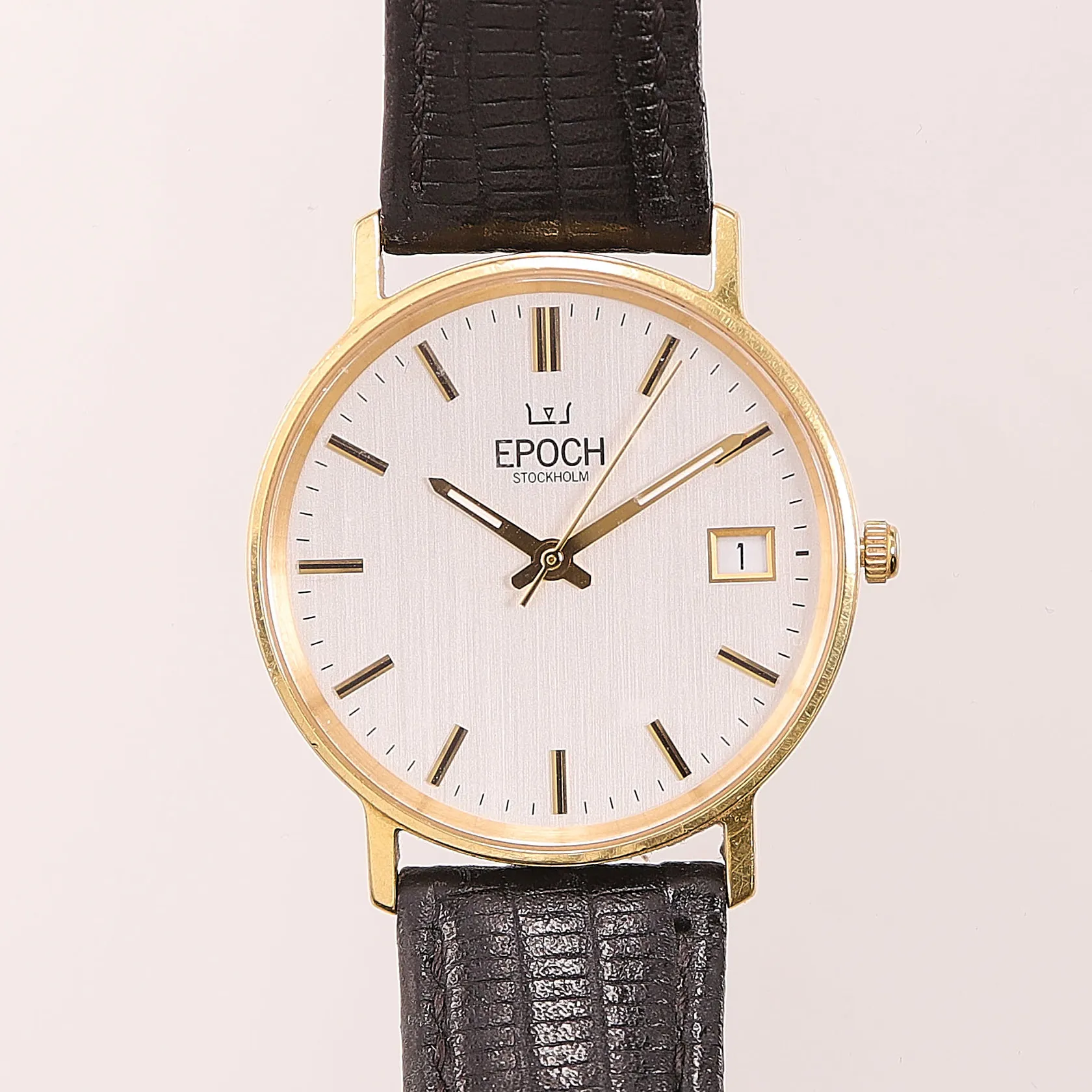 Herrur Epoch 18K, 33,5mm, quartz, gravyr, slitet läderband, batteribyte krävs, etui.