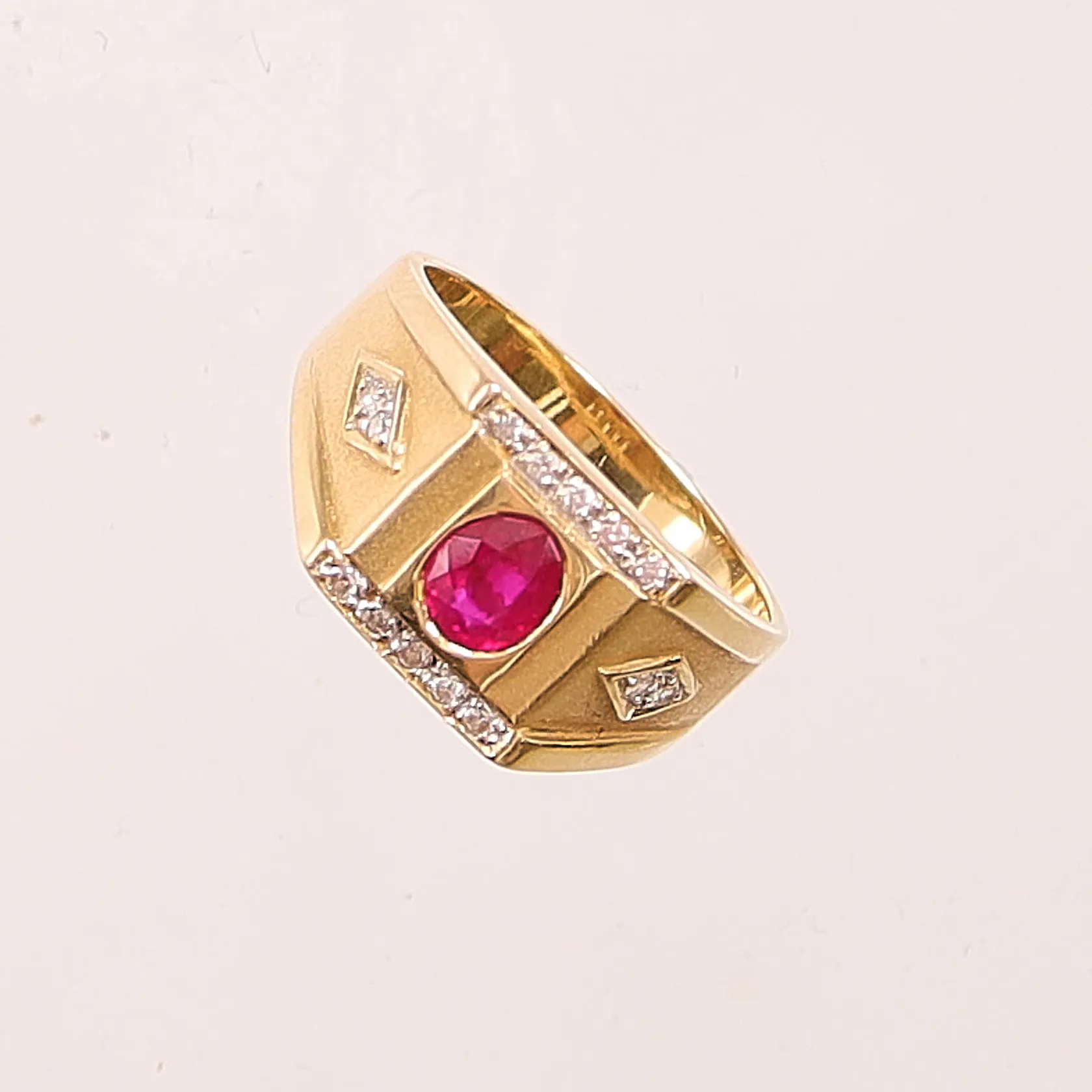 Klackring med syntetisk rubin samt diamanter 14 x ca. 0,01ct, Ø18¼, bredd: 4-10,7mm, 18K, 6,6g. Vikt: 6,6 g.