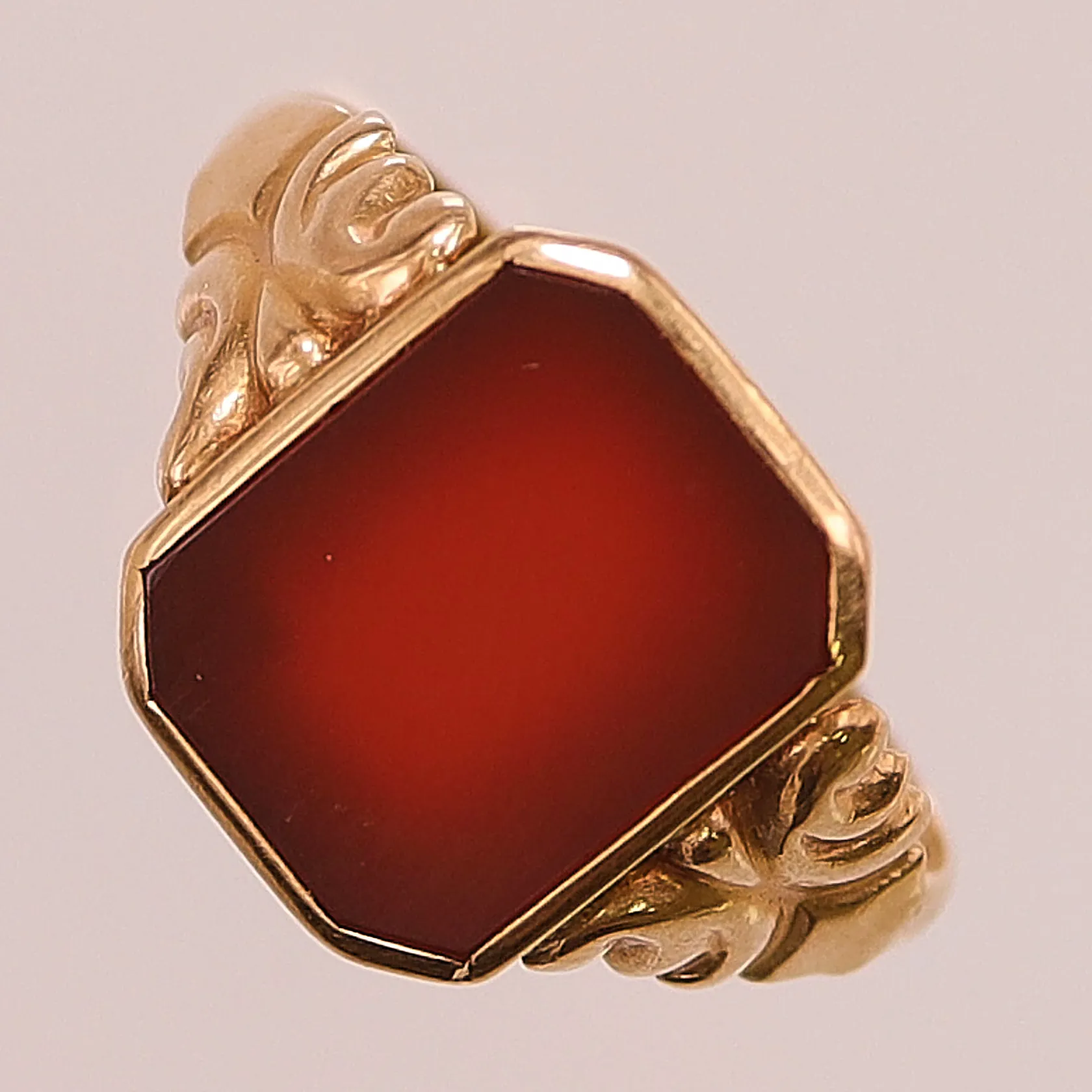 Klackring med karneol, 12x14,6mm, Ø20,25, 18K 3,8g. Vikt: 3,8 g.