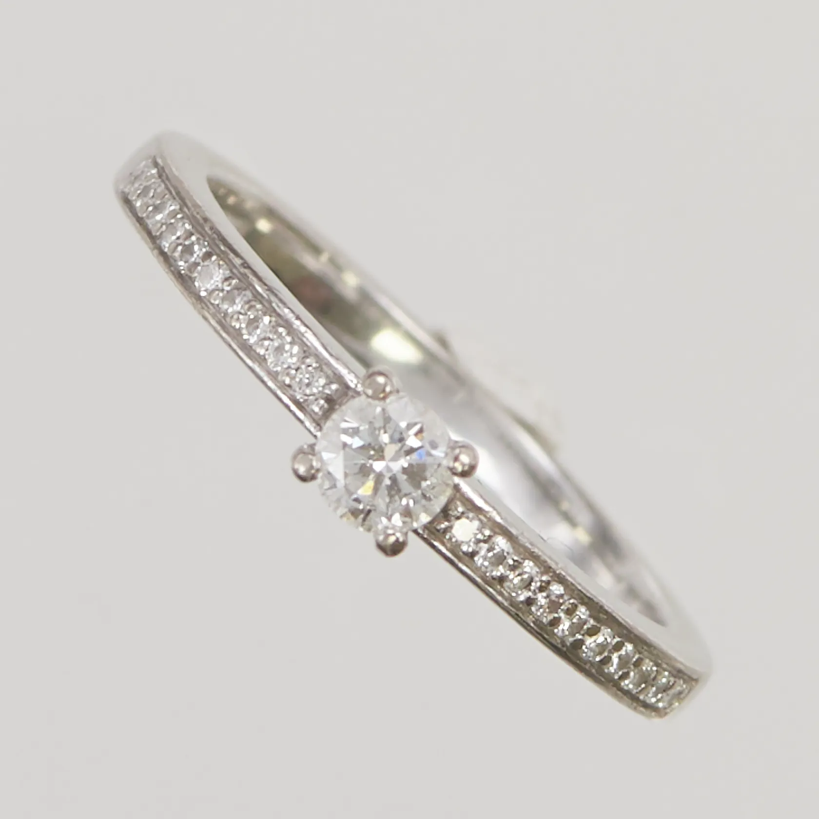 Ring med diamanter 1xca0,18ct + 20xca0,005ct, Ø17½, bredd: 3,8mm, rodieringsbehov, Guldfynd, vitguld, 18K, 3,6g. Vikt: 3,6 g.