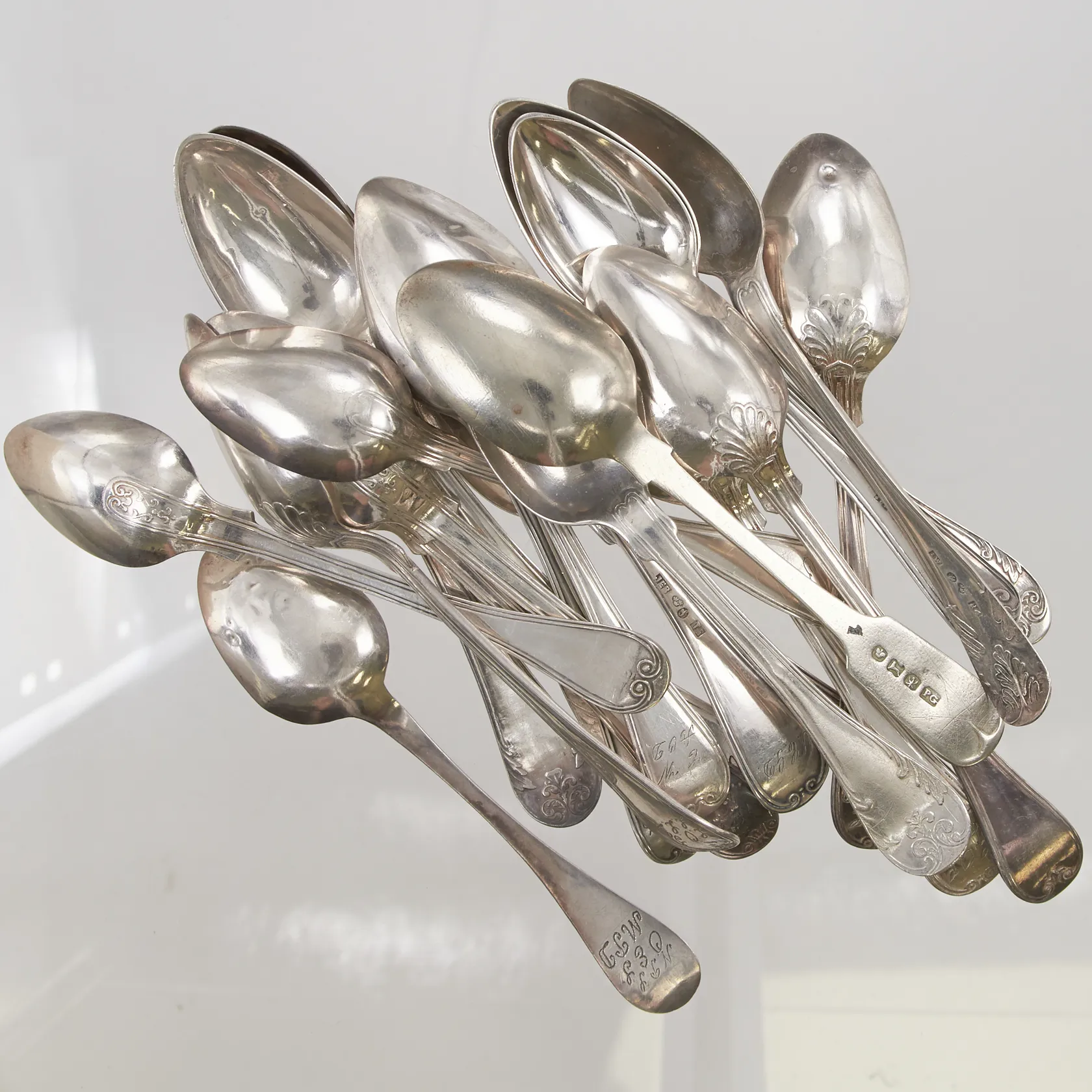 Skedar, 20st blandade modeller, gravyr och skador finns, 11-12cm, Silver S830/1000, 240g. Vikt: 240 g.