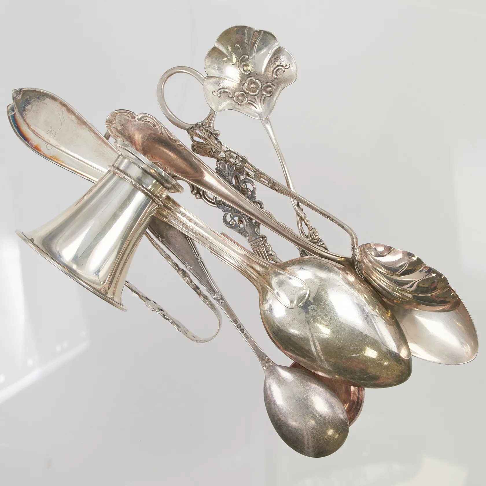Diverse silver, skedar, tänger och en pokal, S830/1000, 292,6g. Vikt: 292,6 g.