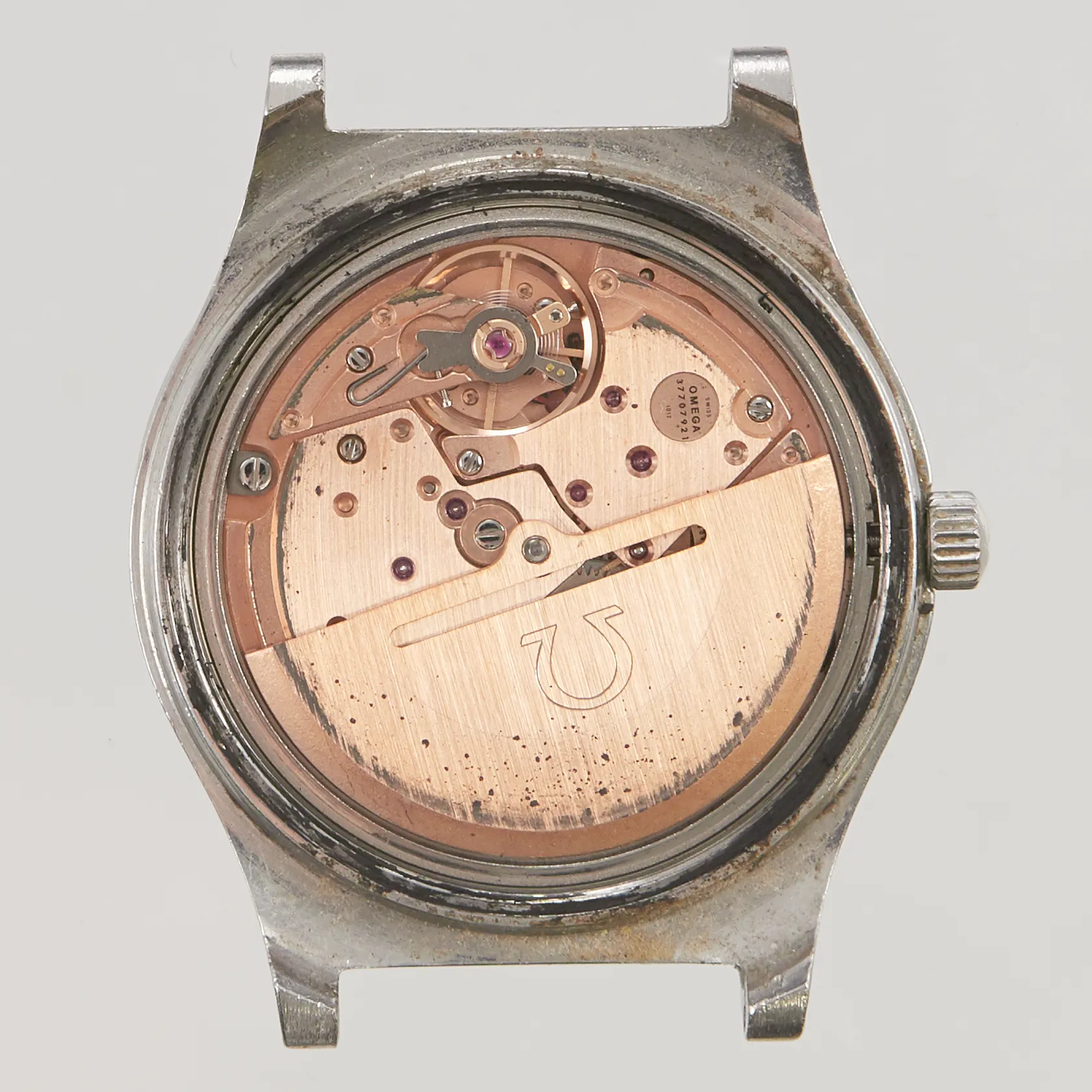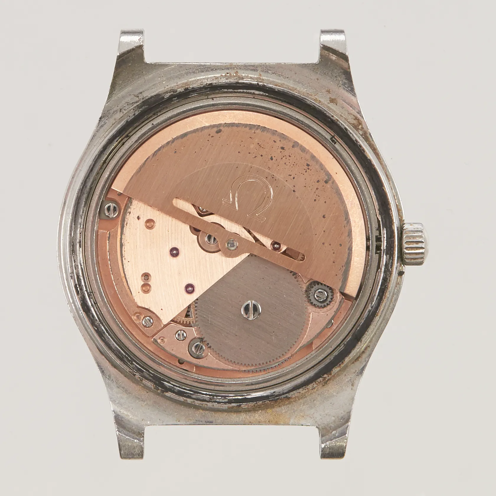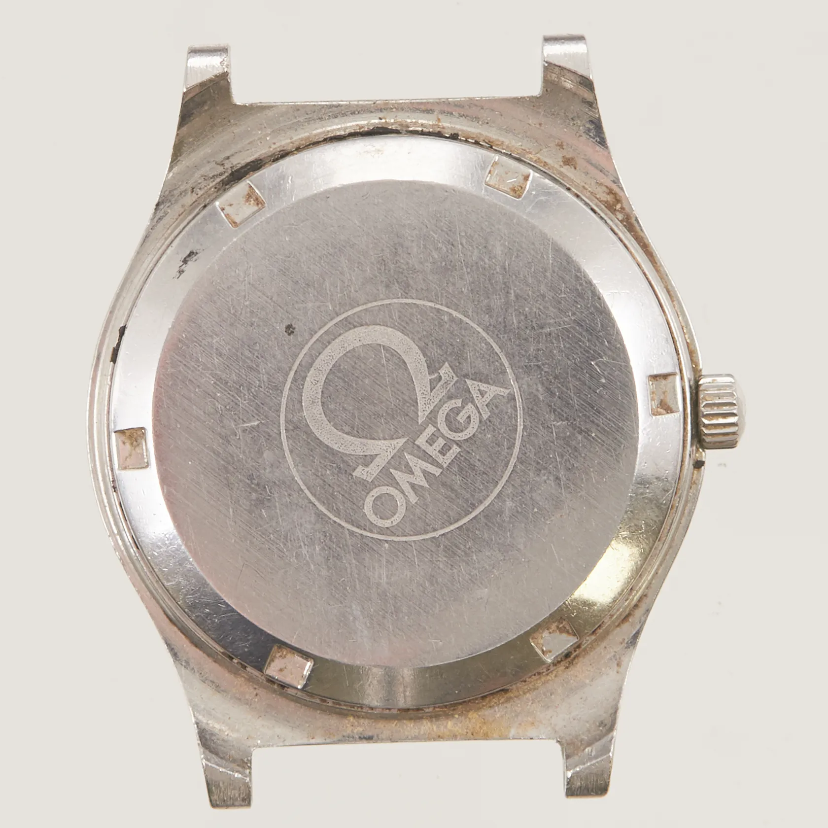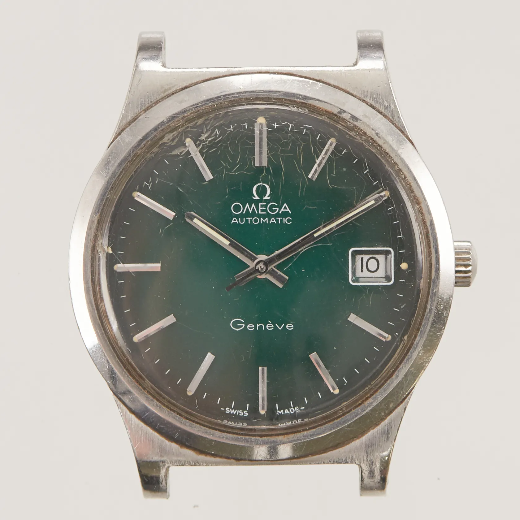 Herrur Omega Geneve, 36mm, stål, automatisk, boettnr: 166.0168, cal. 1012, verknr: 37707921, repigt plexiglas, smutsigt urverk, defekt packring, stållänk ej original, inga tillbehör