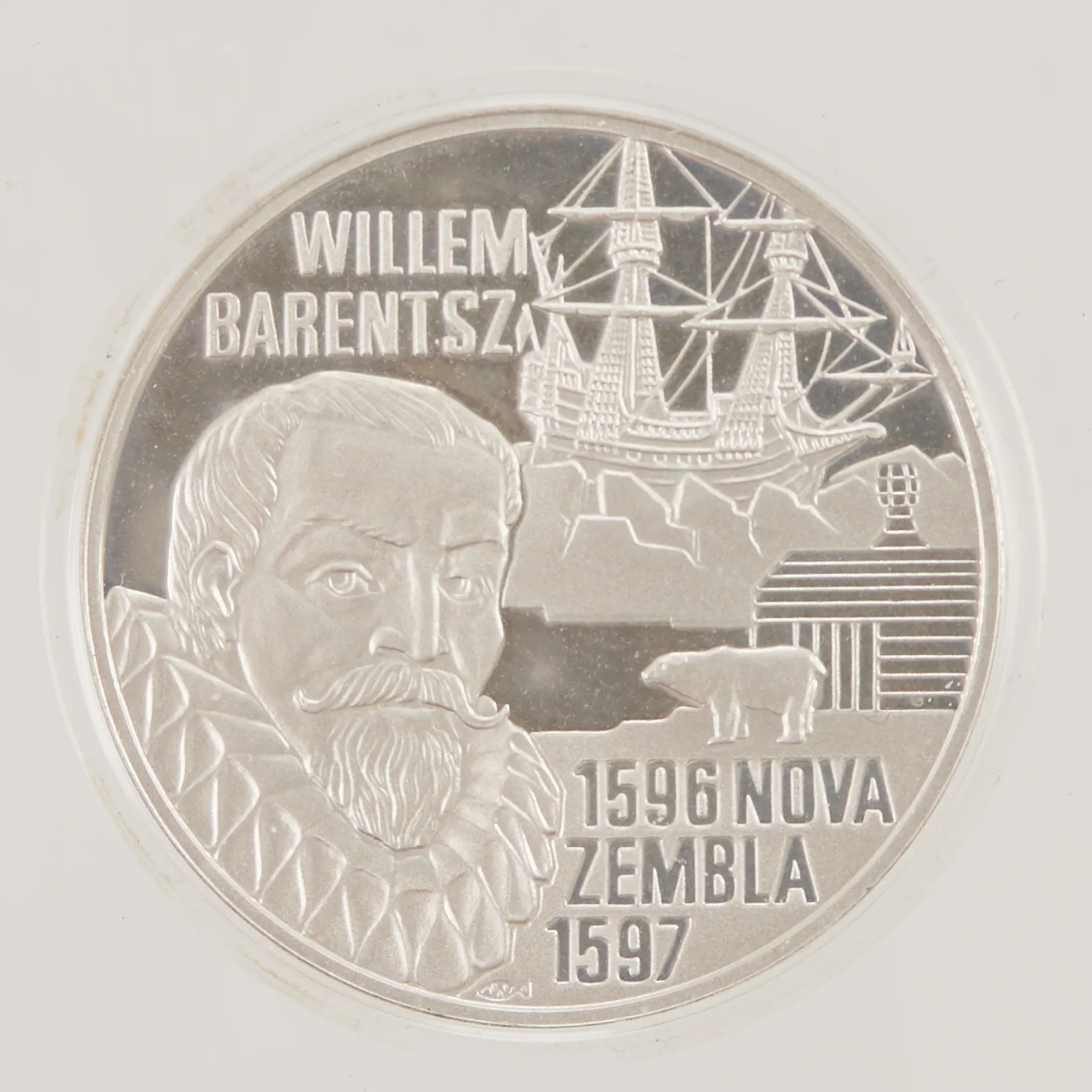 Silverynt, 50 Euro - Beatrix Willem Barentsz, Ø38mm, präglat år 1996 för att högtidlighålla 500årsjubileet av Barentsz övervintring i Nova Zembla, plastetui, 925/1000 silver, 25,0g. Vikt: 25 g.