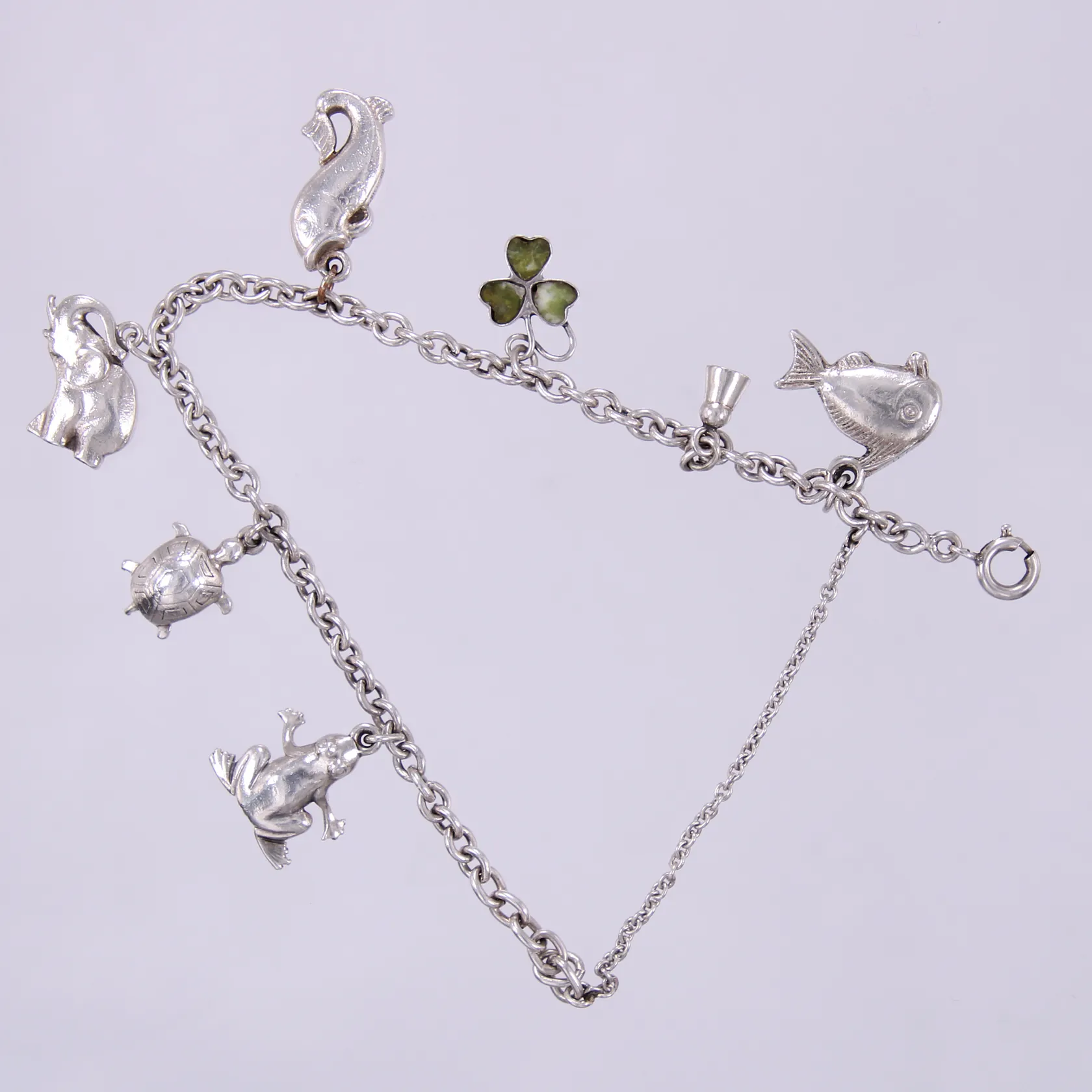 Armband med berlocker, Georg Jensen, troligtvis 30-tal, längd: ca 19,5cm, bredd: ca 3mm, alla ej stämplade, 835/1000, silver Vikt: 27,6 g.