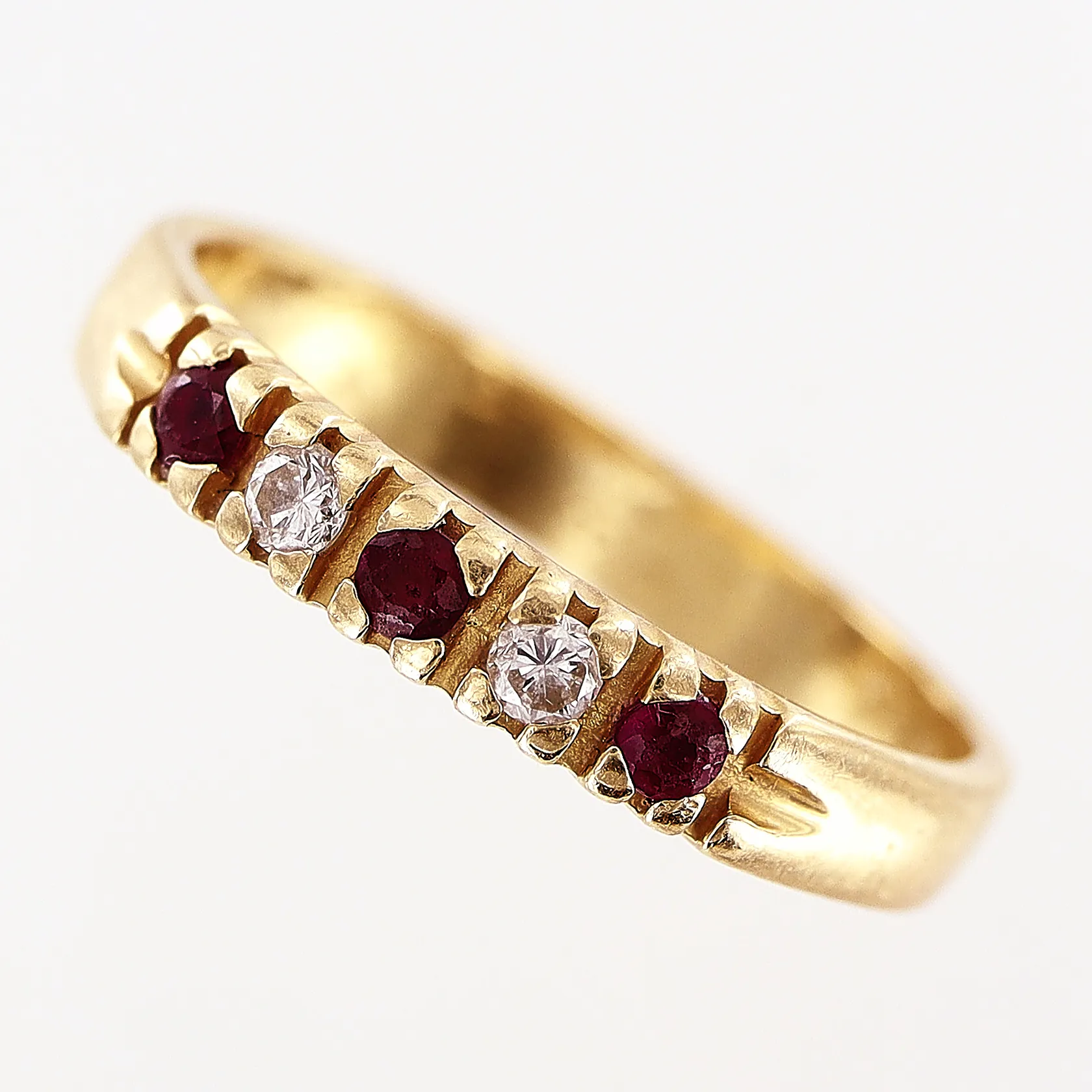 Ring, diamanter 2 x ca0,02ct, röda stenar, stl 16¼, bredd 3mm, gravyr, 18K. Vikt: 2,8 g.