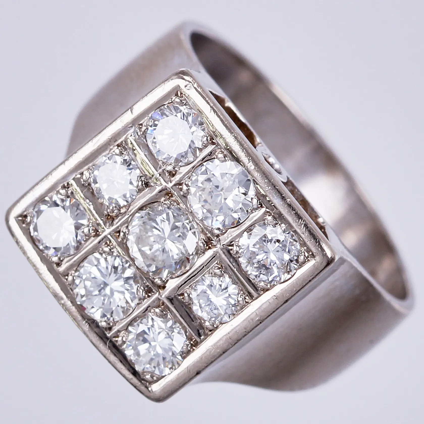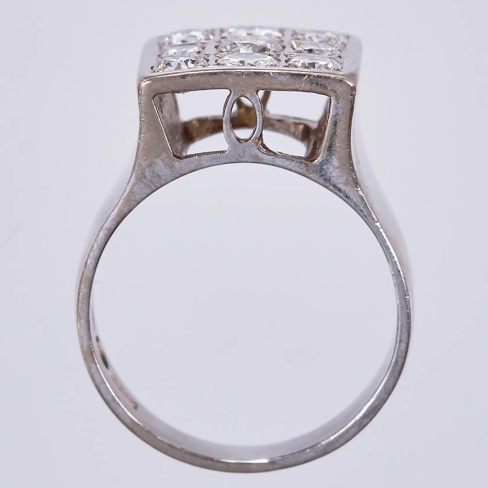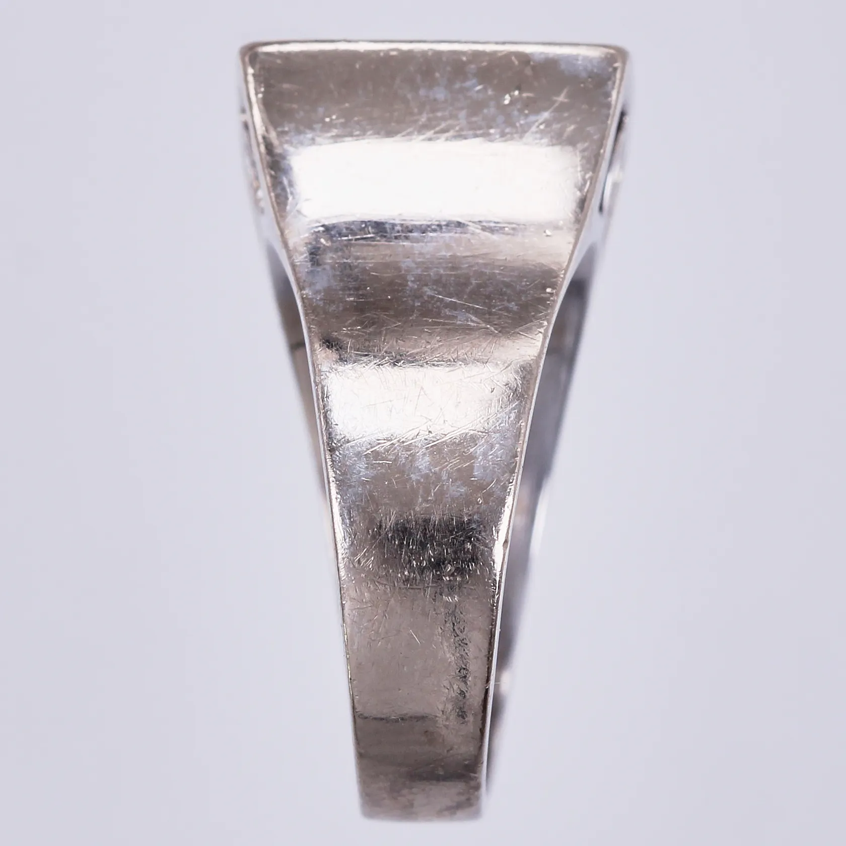 Klackring vitguld med diamanter ca 1x0,15ct, 2x0,10ct, 5x0,05ct, stl: 15½, bredd: ca 3-12mm, Alp Guldsmedja Gunnar år 1975,18K Vikt: 8,1 g.