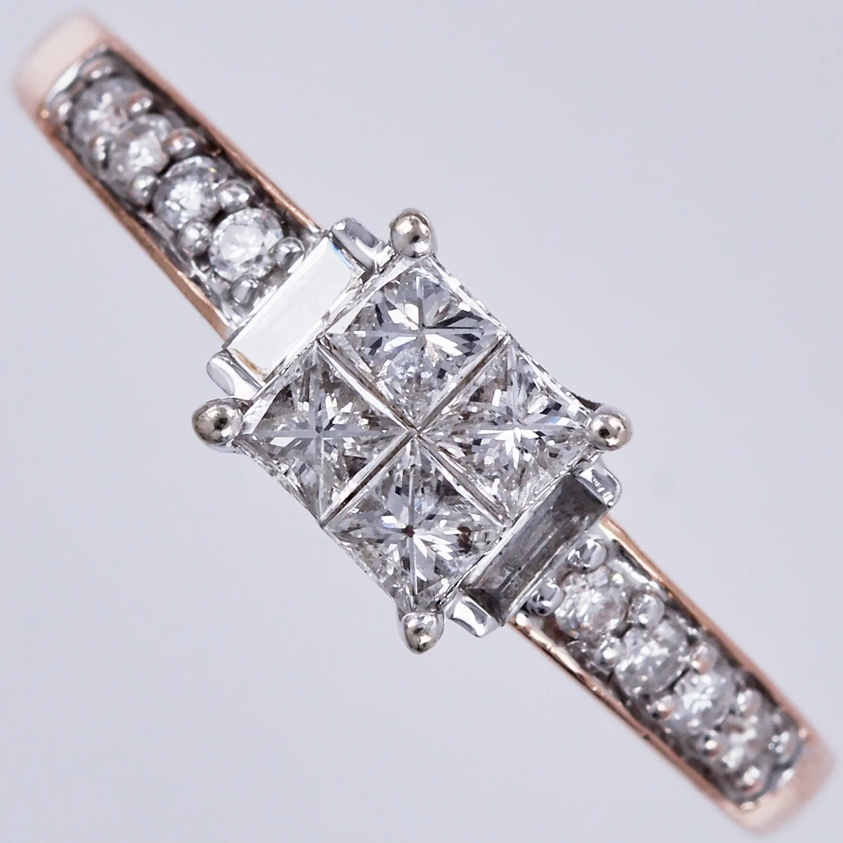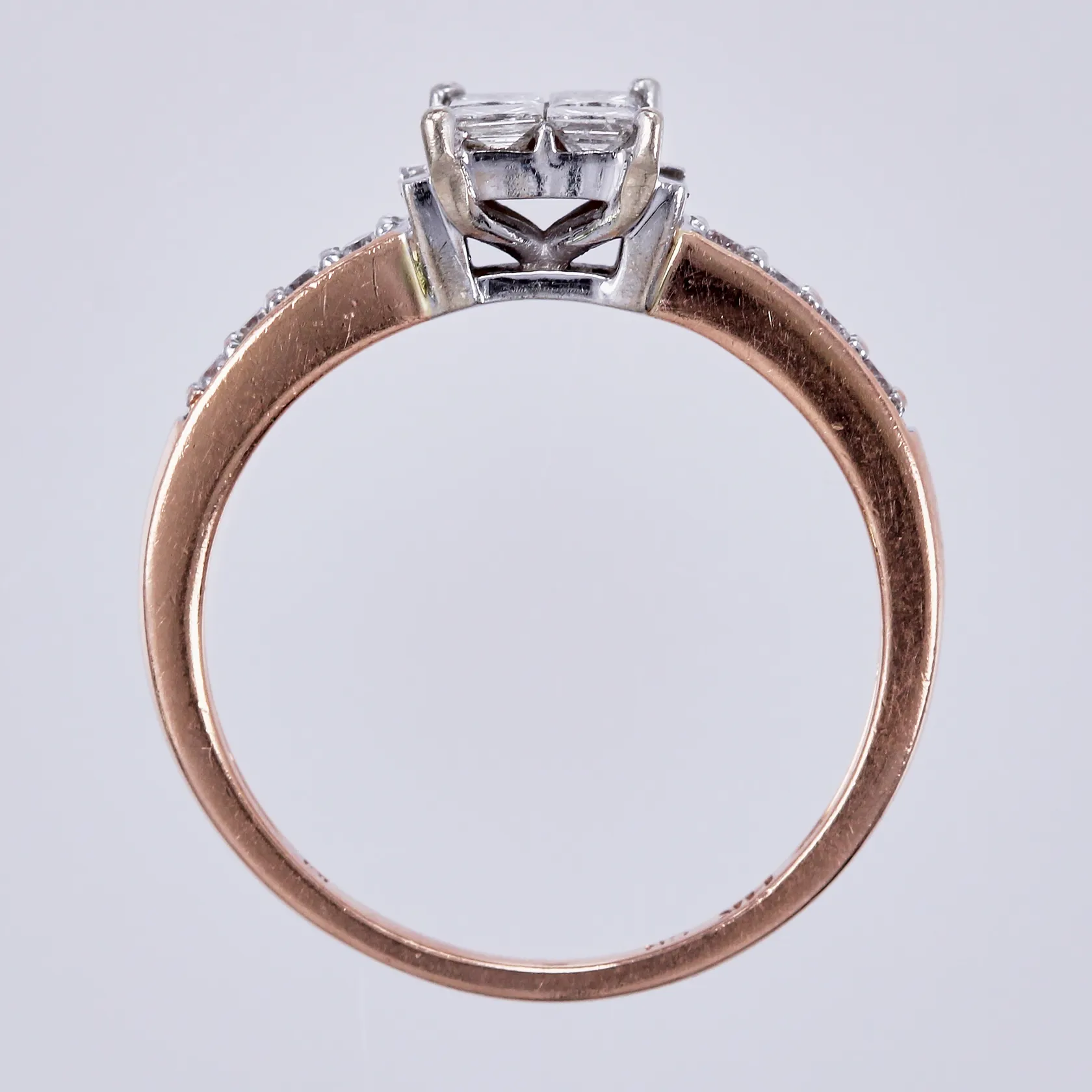 Ring med prinsessslipade diamanter, ca 4x0,15ct, varav en indikerar på syntetiskt, ca 8x0,01ct, stl: 18, bredd: ca 1-6mm, Rosé, 14K Vikt: 2,9 g.