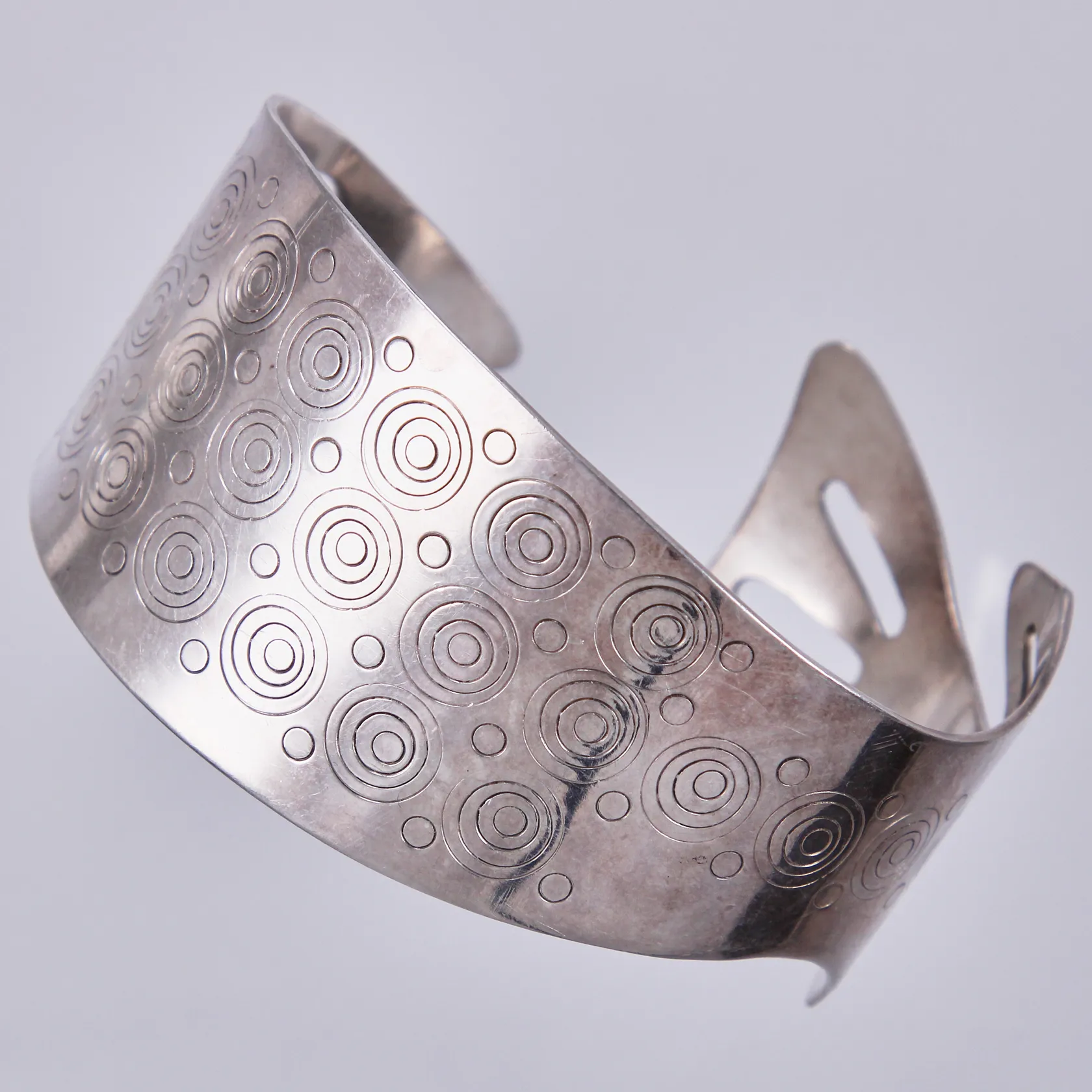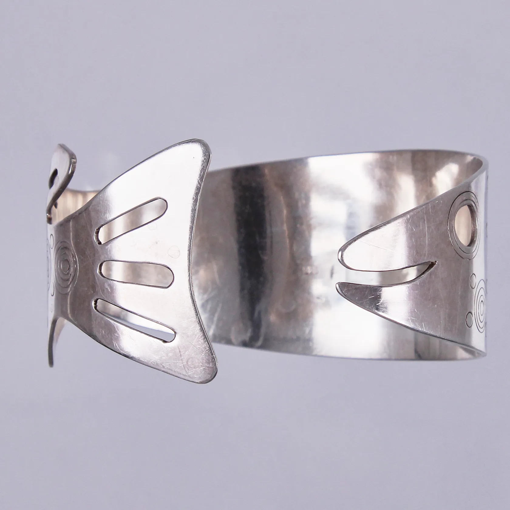 Stel Armring Fisk, Ø ca 5,5cm, bredd ca 10-35mm, justerbar, 925/1000 silver Vikt: 46,7 g.