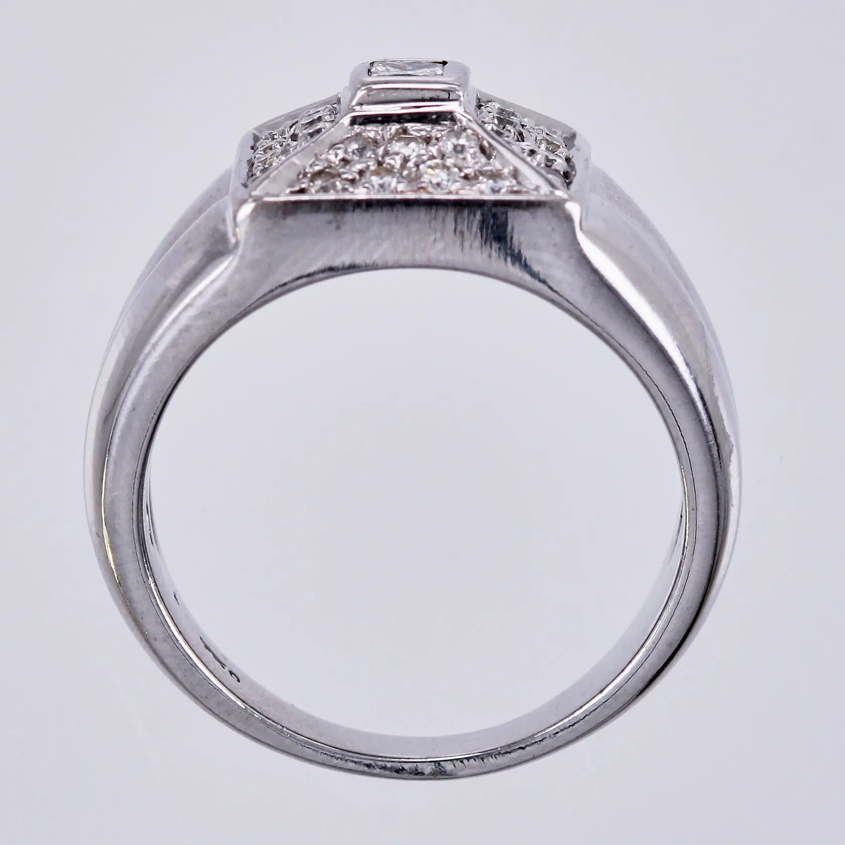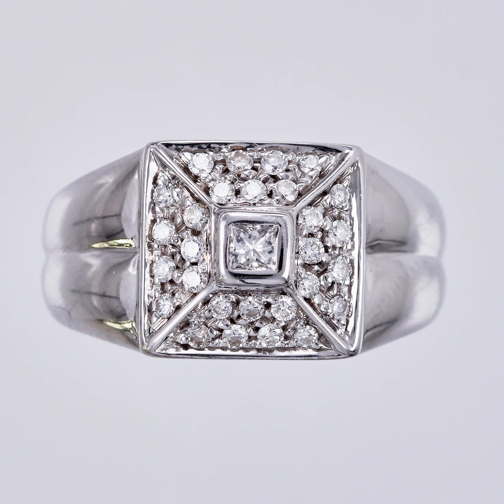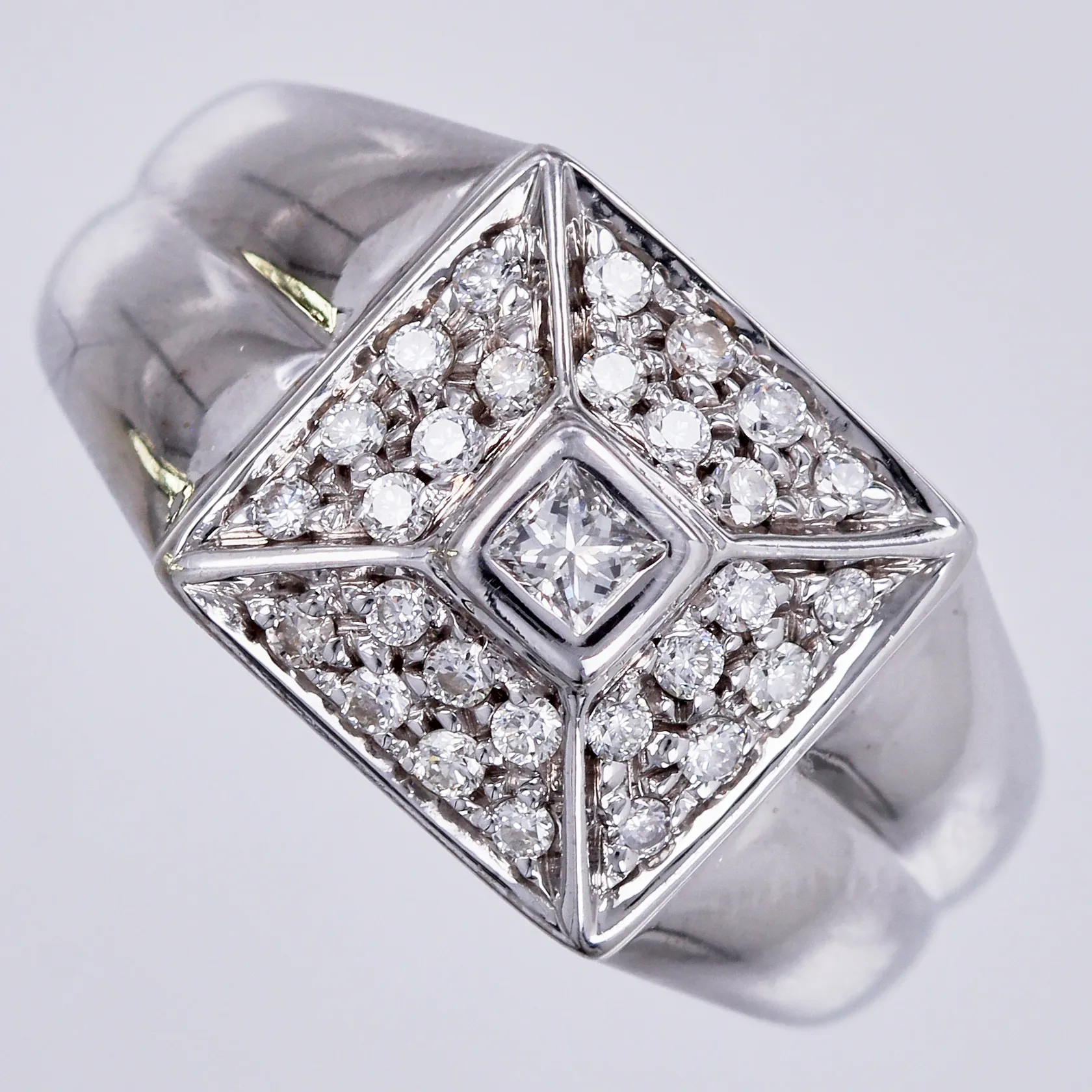 Ring med diamanter ca 1x0,12ct prinsesslipad, 28xca 0,02ct, stl: ca 17, bredd: ca 3-10mm, vitguld, 18K Vikt: 9,9 g.